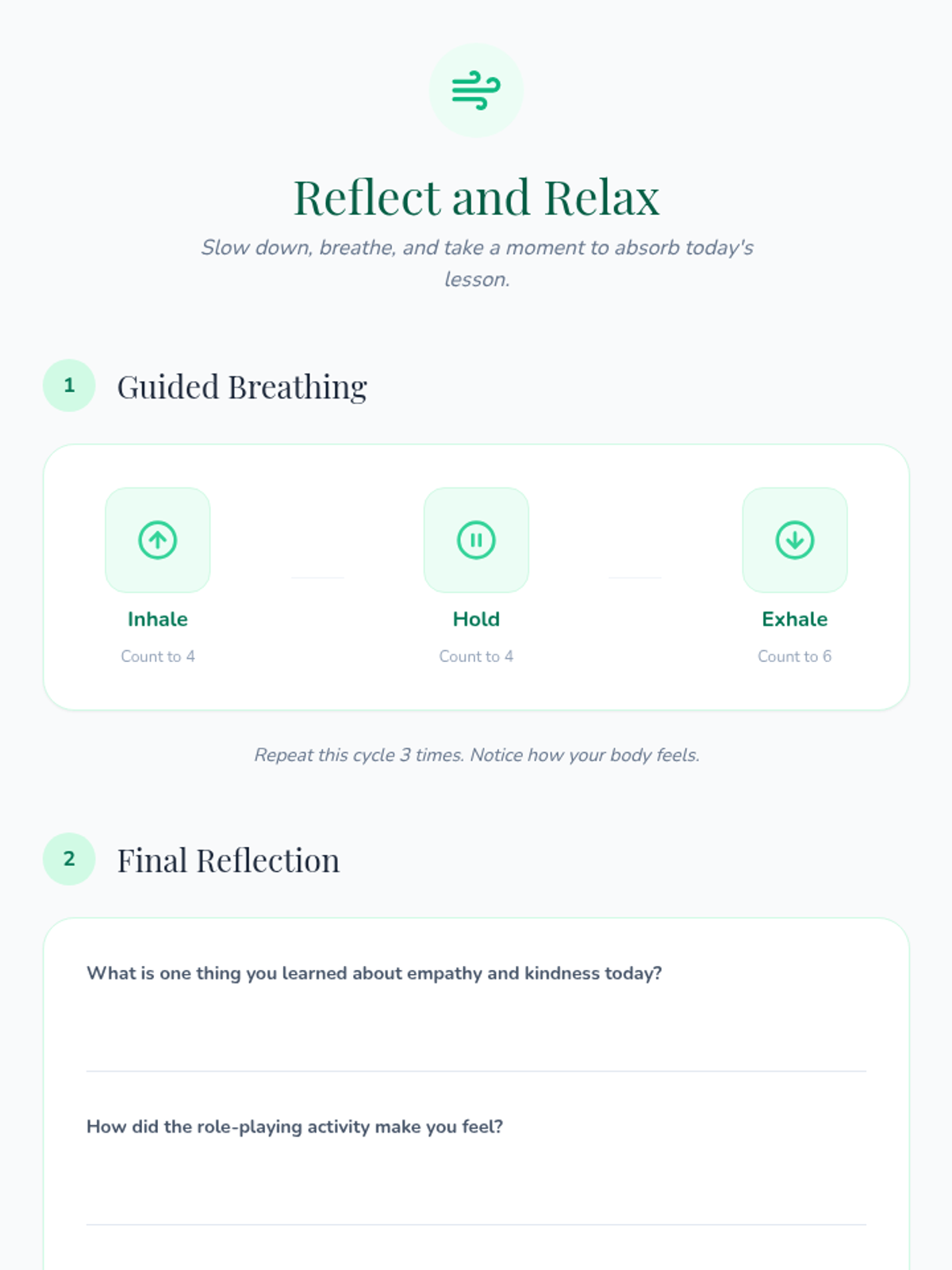 A cool-down guide for mindfulness and reflection following an empathy lesson. Includes a guided breathing exercise and prompts for final takeaways.