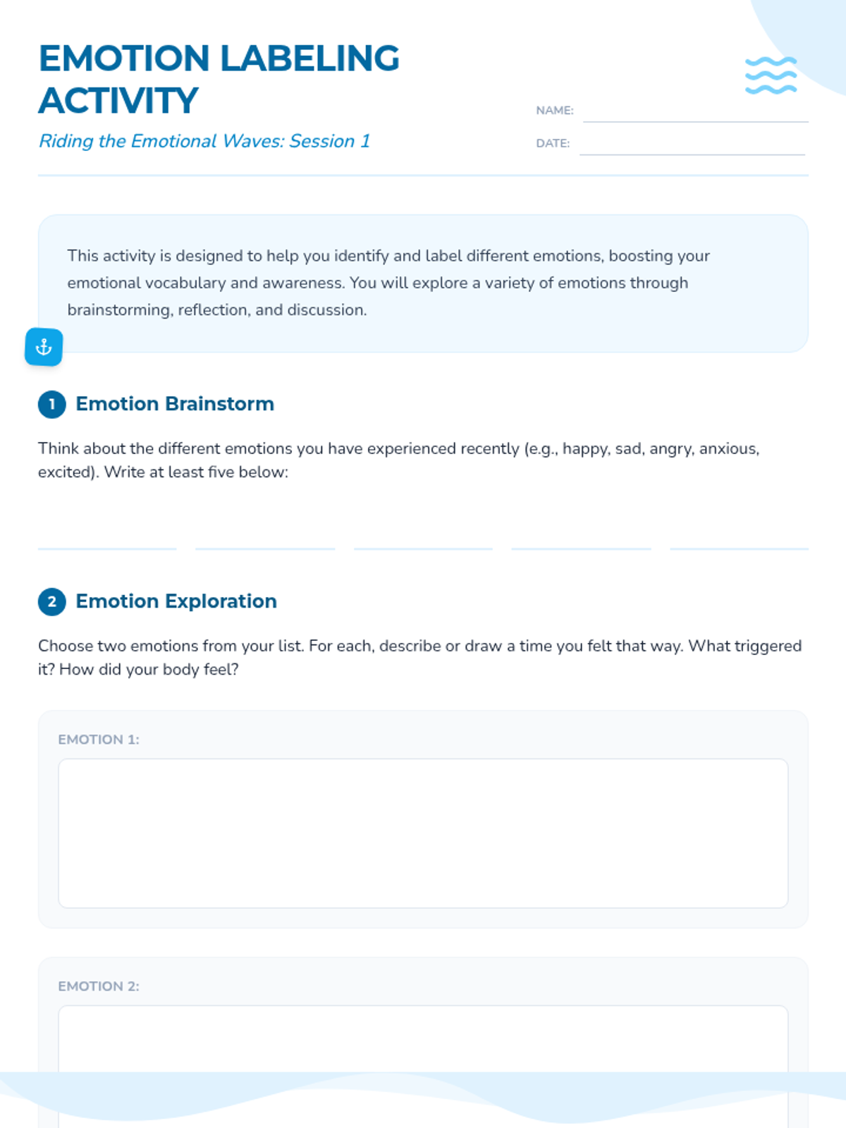 A student worksheet for Session 1 that helps students identify and label emotions through brainstorming and reflection.