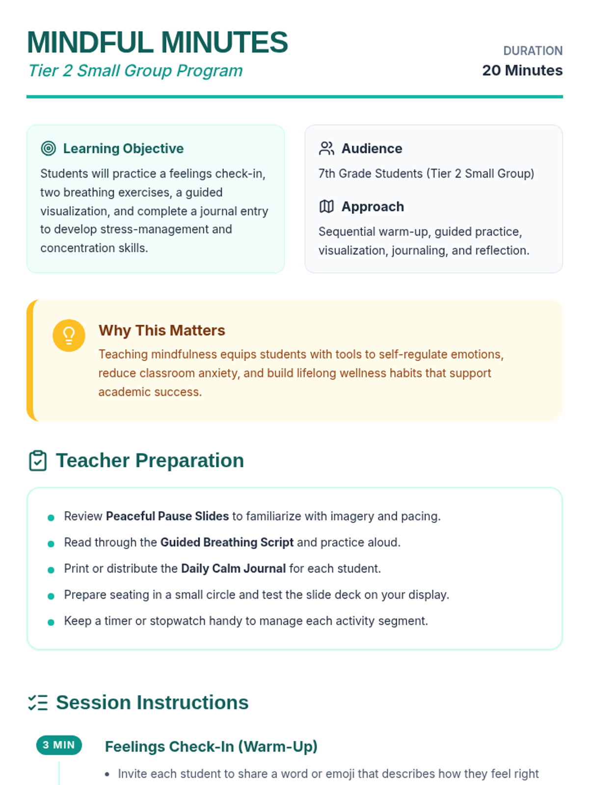 A comprehensive session plan for Mindful Minutes, covering preparation, objectives, and a step-by-step instructional sequence for a 20-minute small group session.