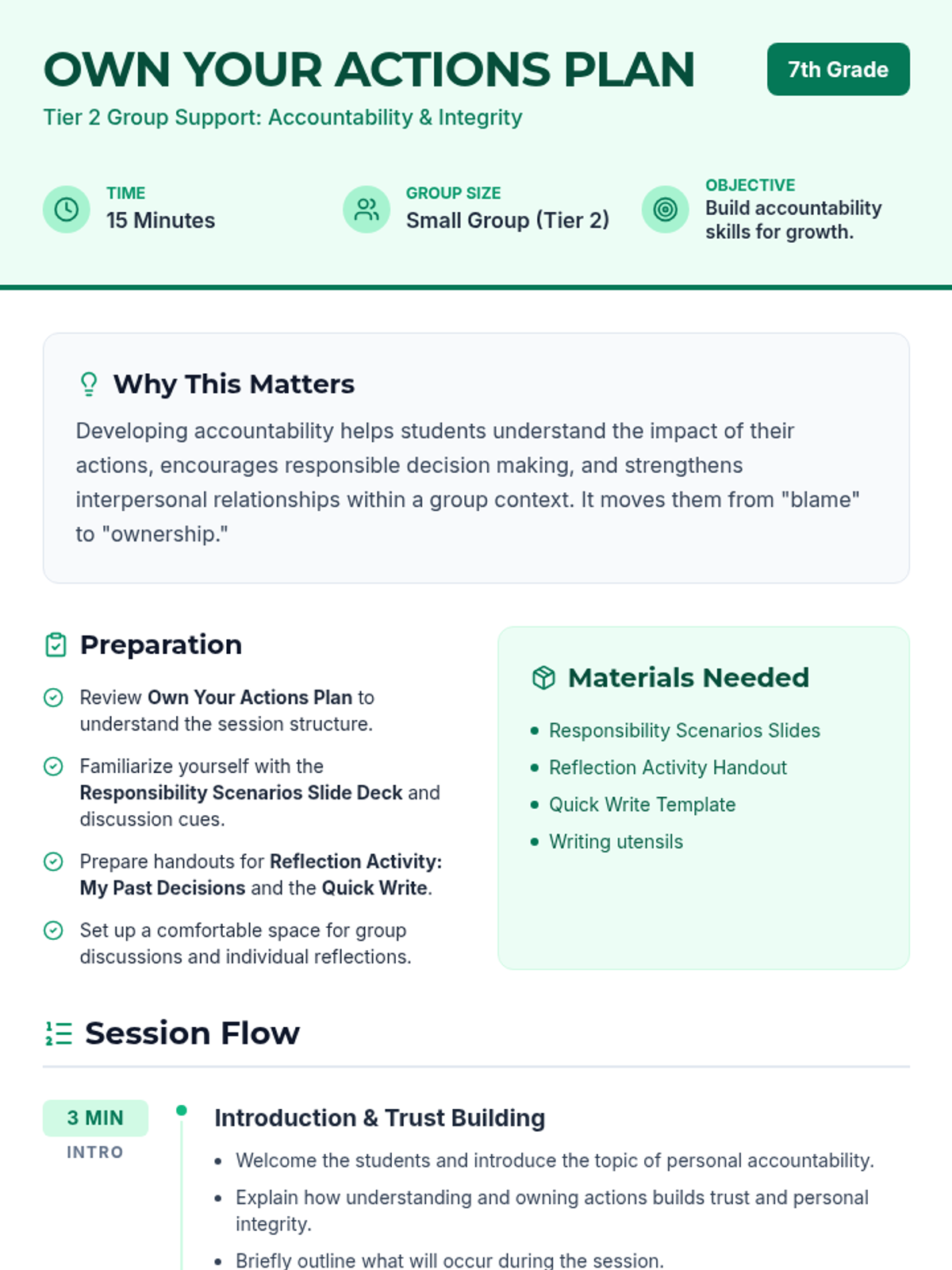 A detailed instructional guide for a 15-minute small group session on personal accountability, including preparation steps, timed activities, and teaching notes.