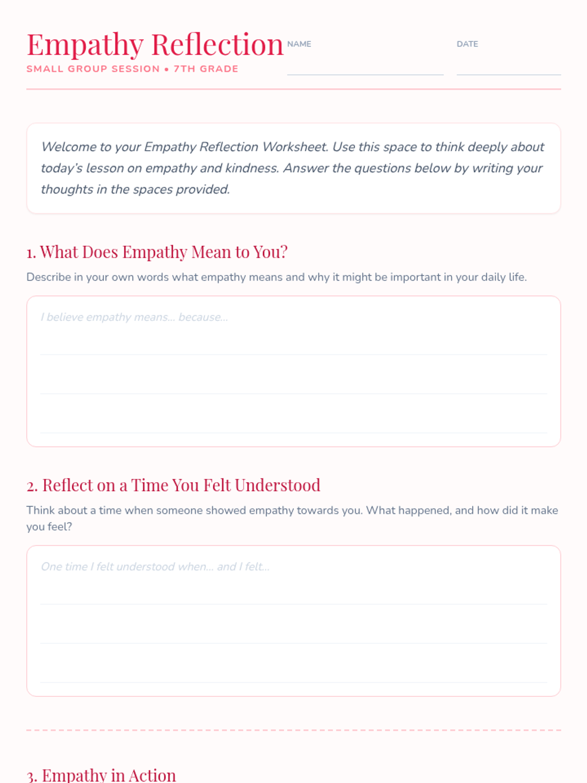 A reflective worksheet for students to process the concept of empathy, recall personal experiences, and plan kind actions for the future. Includes sentence stems and ample writing space.