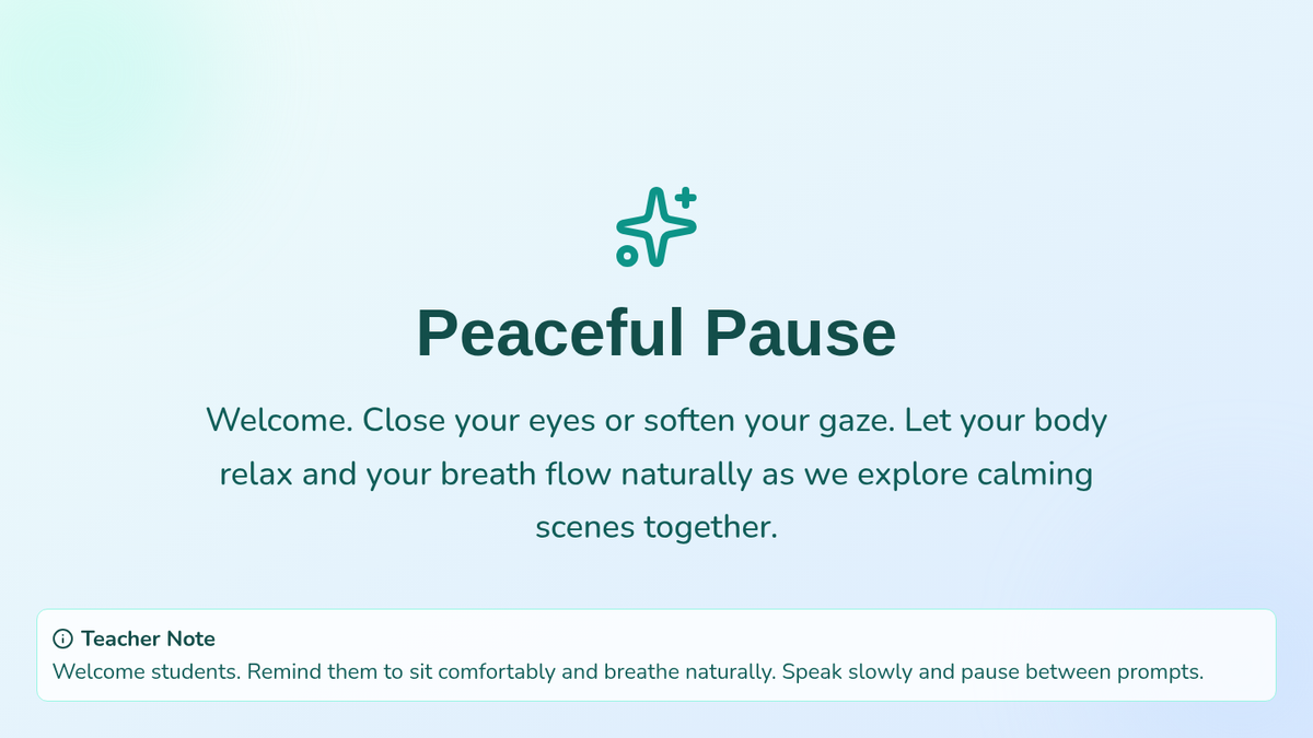 A visual presentation for the visualization segment of Mindful Minutes, featuring calming prompts and teacher guidance for several relaxing environments.