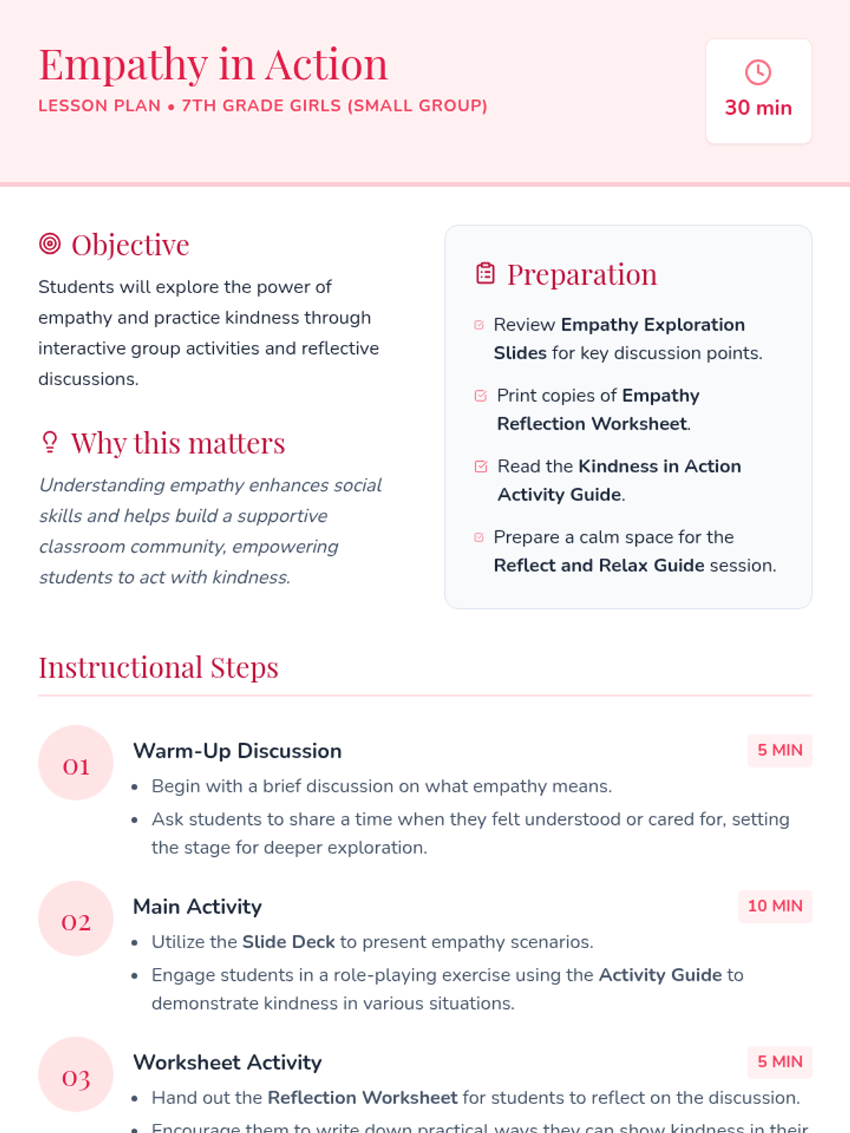 A comprehensive lesson plan for a 30-minute Tier 2 group session focusing on empathy and kindness for 7th-grade girls. Includes timing, objectives, and a step-by-step instructional sequence.