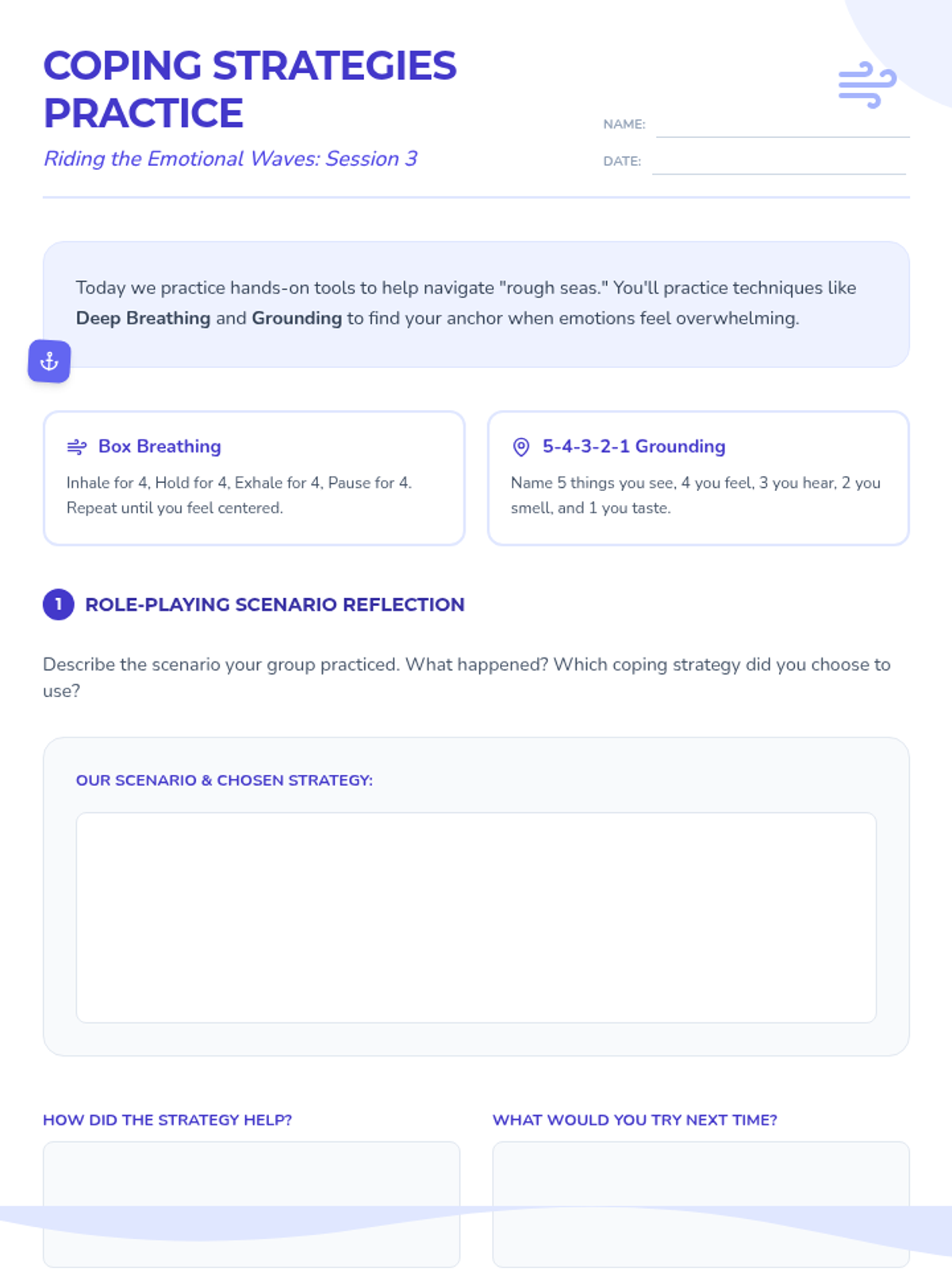 A student practice worksheet for Session 3 focused on rehearsing and reflecting on coping strategies like deep breathing and grounding.