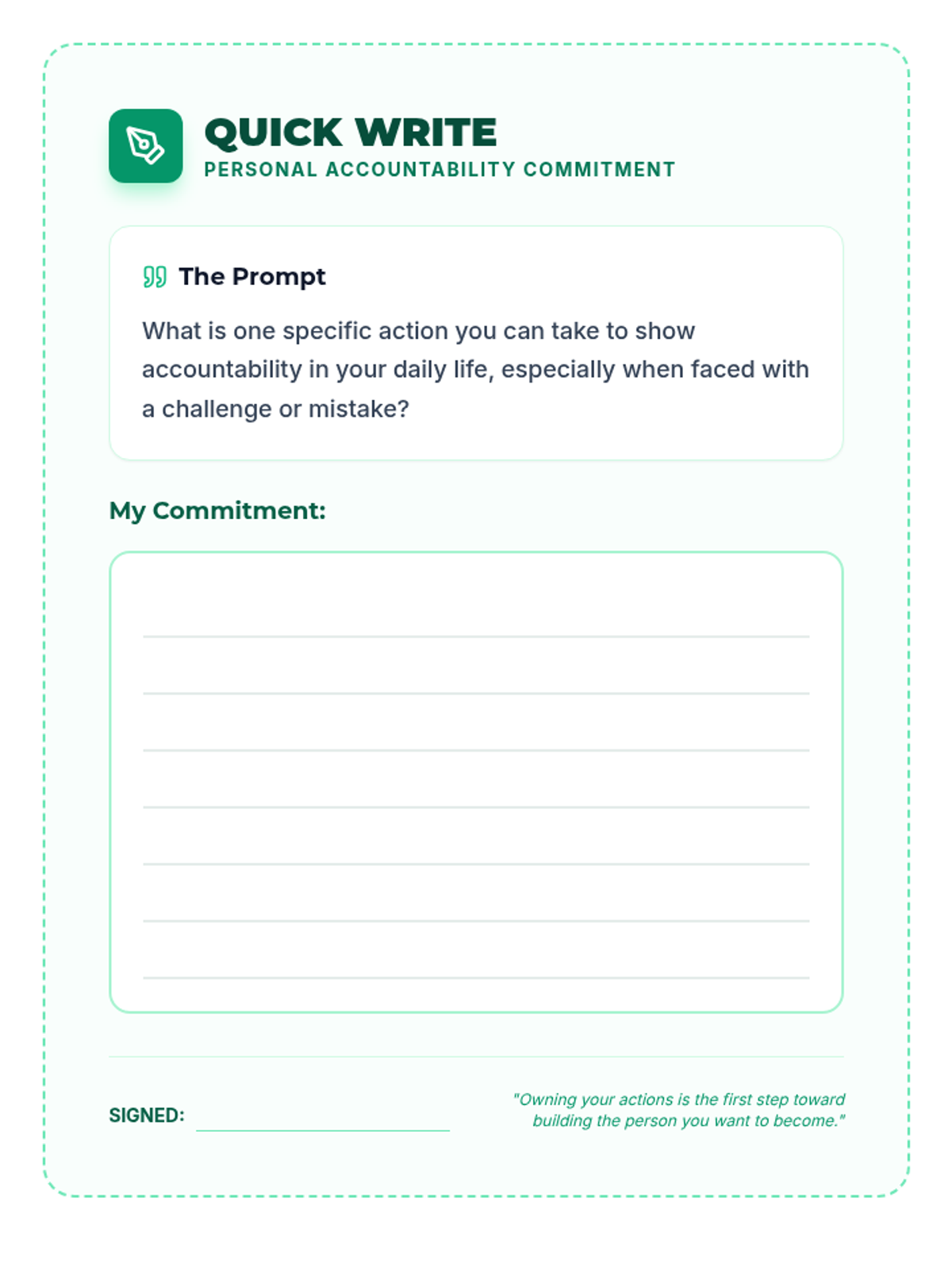 A concise exit ticket where students commit to one specific action they can take to demonstrate personal accountability in their daily lives.