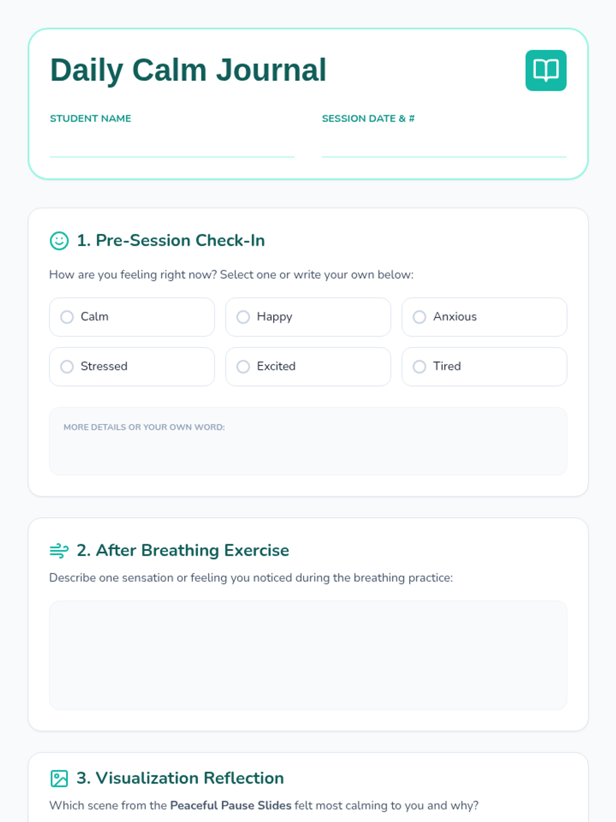 A student journal for reflecting on mindfulness practices, featuring check-ins, reflection prompts for visualization and breathing, and personal strategy planning.