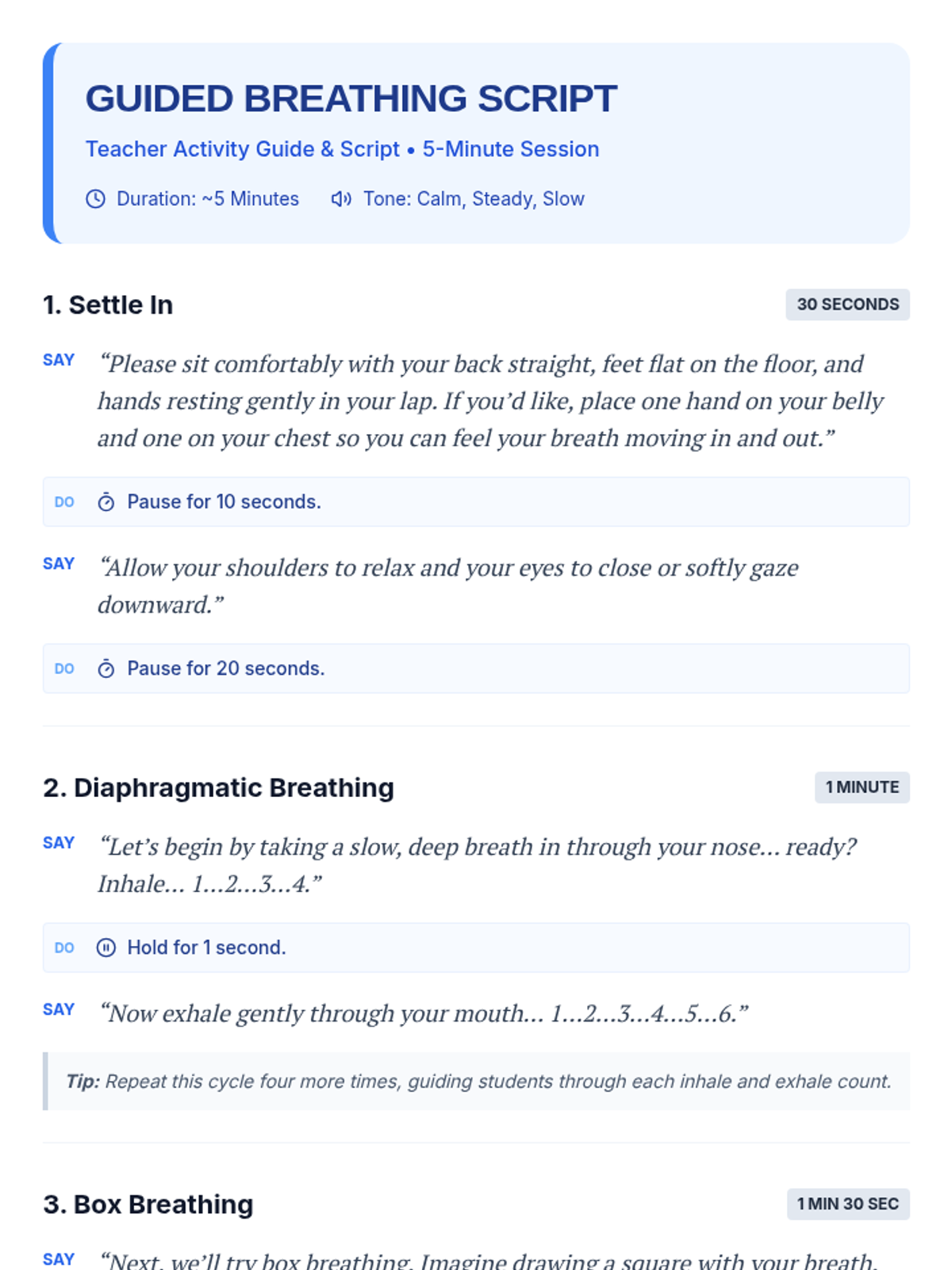 A detailed script for facilitating breathing exercises, including settling-in prompts, diaphragmatic breathing, box breathing, and transition cues.
