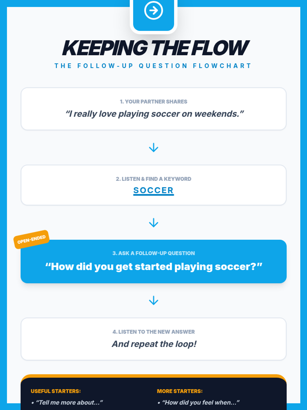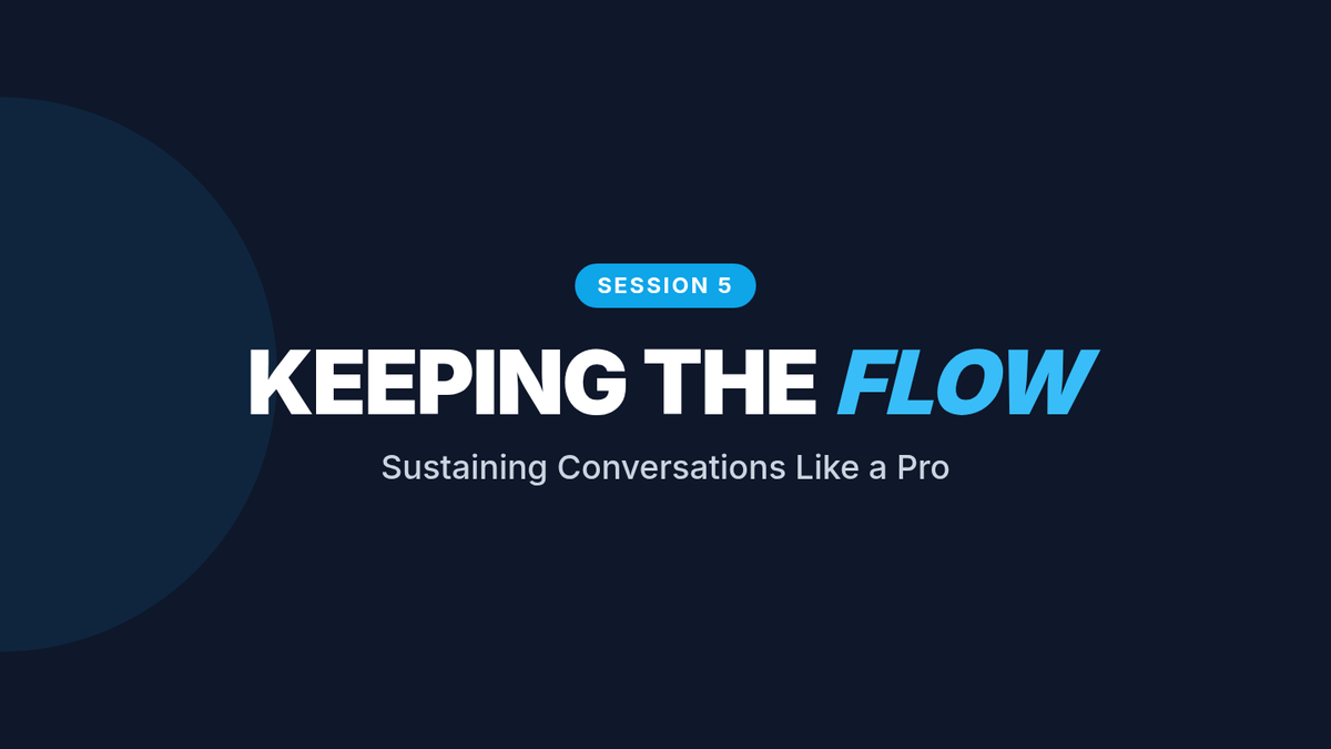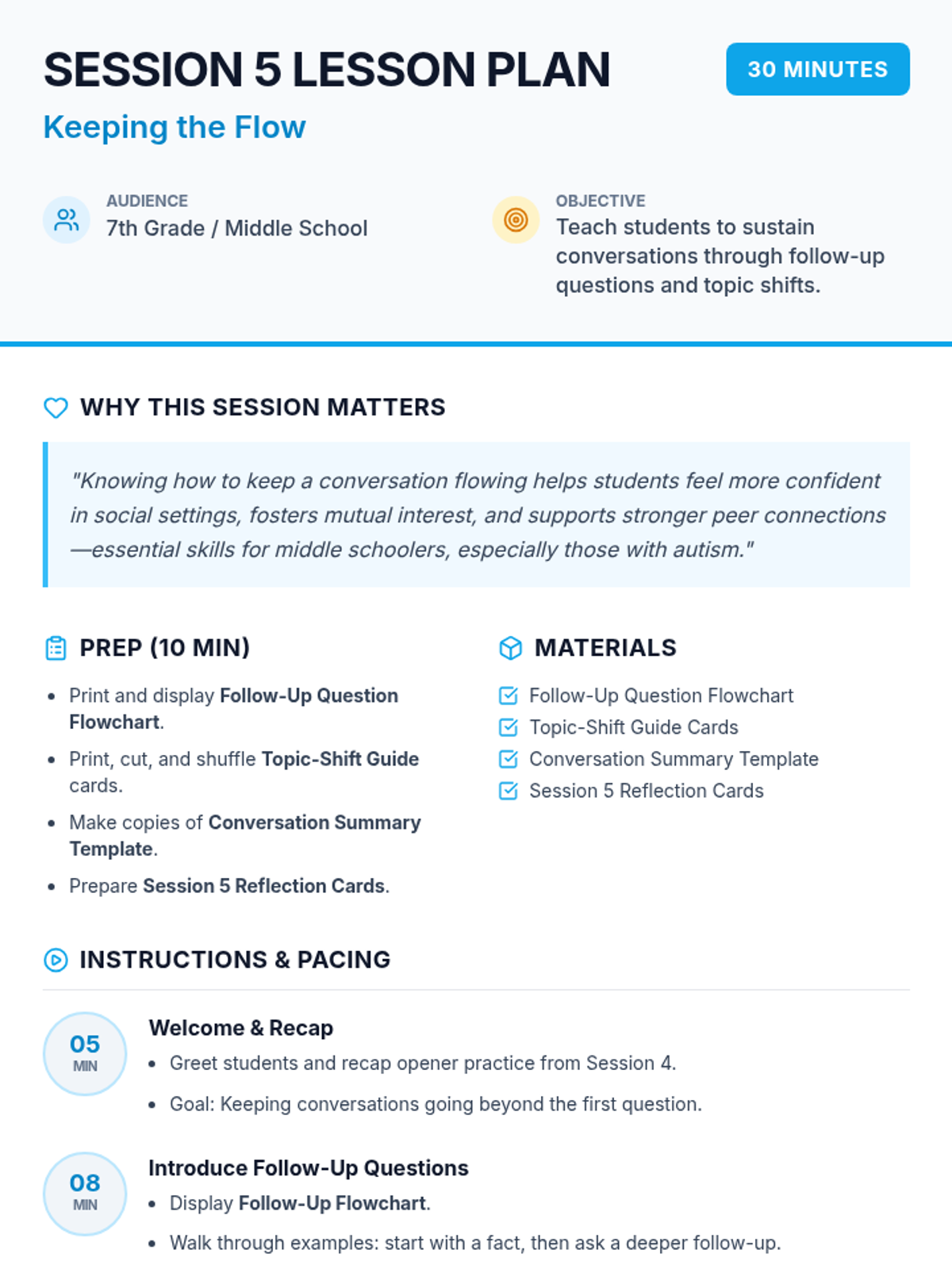 Visual flowchart for follow-up questions, topic-shift cards, conversation summary template, and reflection cards for Session 5.