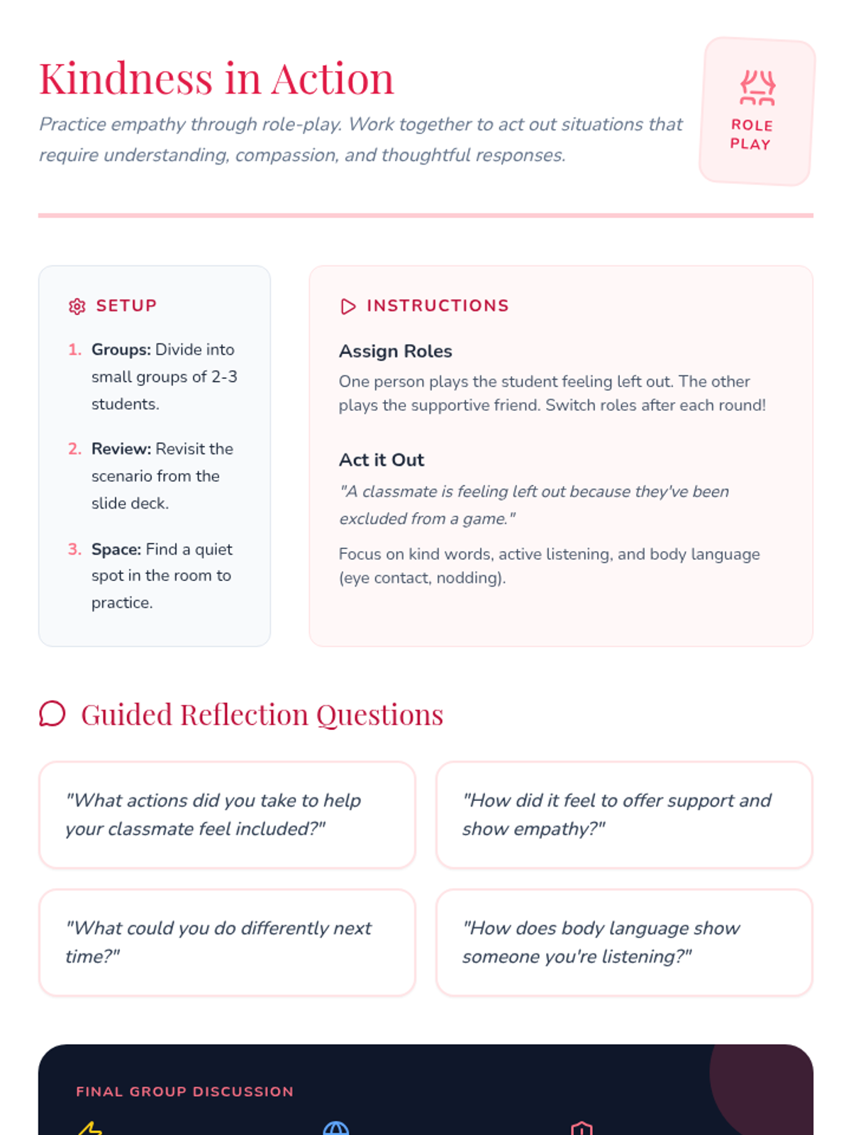 A guide for a role-playing activity where students practice showing empathy in real-world scenarios. Includes setup instructions, role-play steps, and discussion prompts.