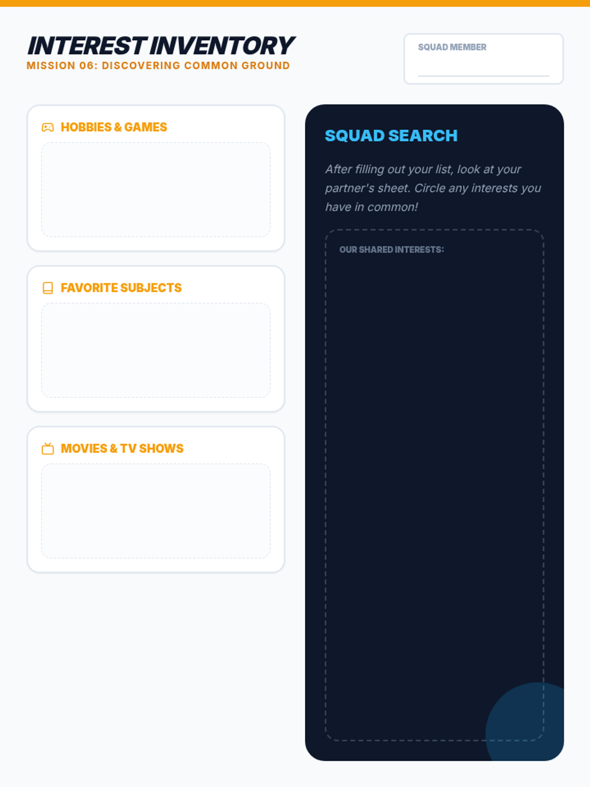 Worksheets for Session 6 including an interest inventory, activity planning template, and final reflection card.