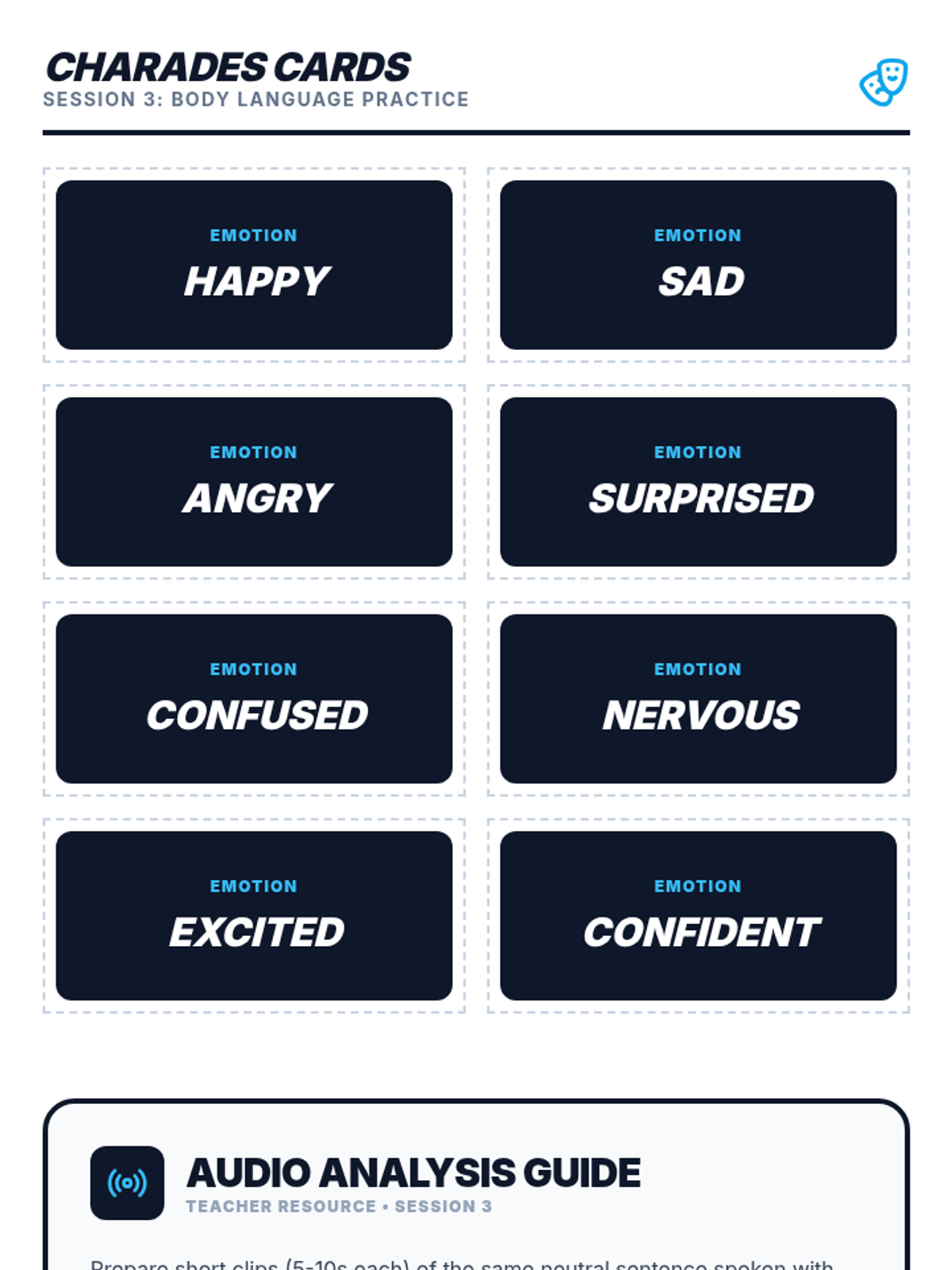 Printable charades cards for body language practice and a teacher guide for the tone of voice audio analysis activity.