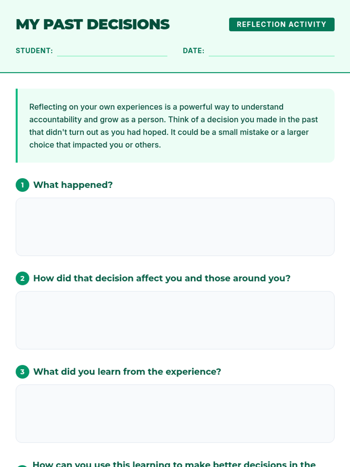 A student reflection worksheet focusing on past decisions, the impact of choices, and lessons learned for future personal growth.