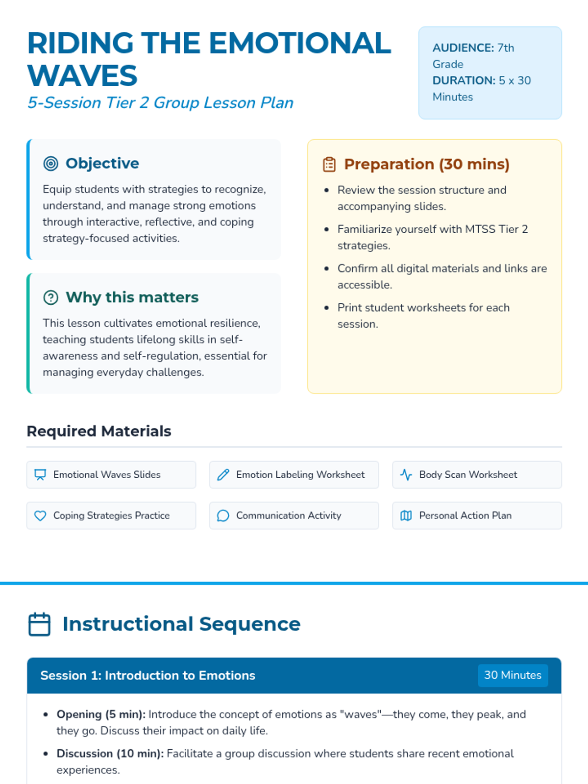 A comprehensive 5-session lesson plan for a Tier 2 emotional resilience group, featuring instructional sequences and preparation steps.