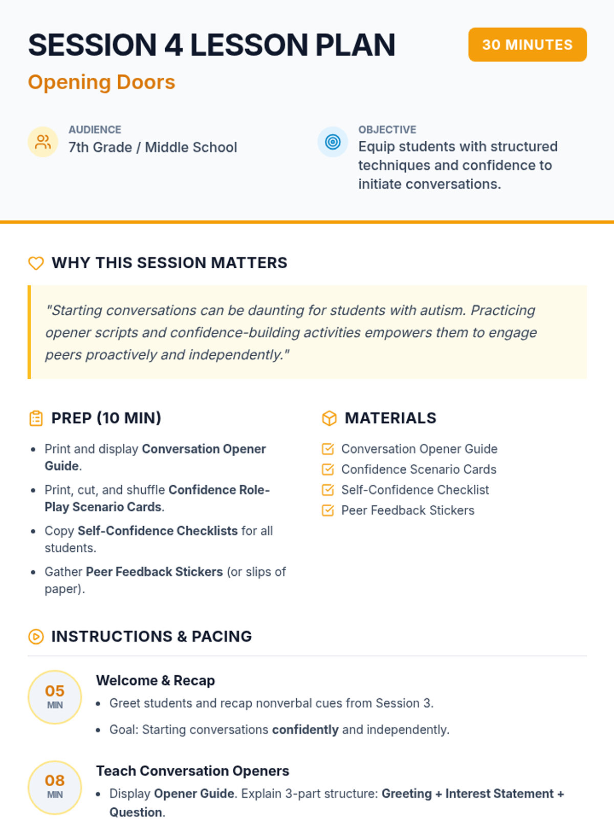 Printable conversation opener guide, scenario cards, self-confidence checklist, and peer feedback sticker templates.