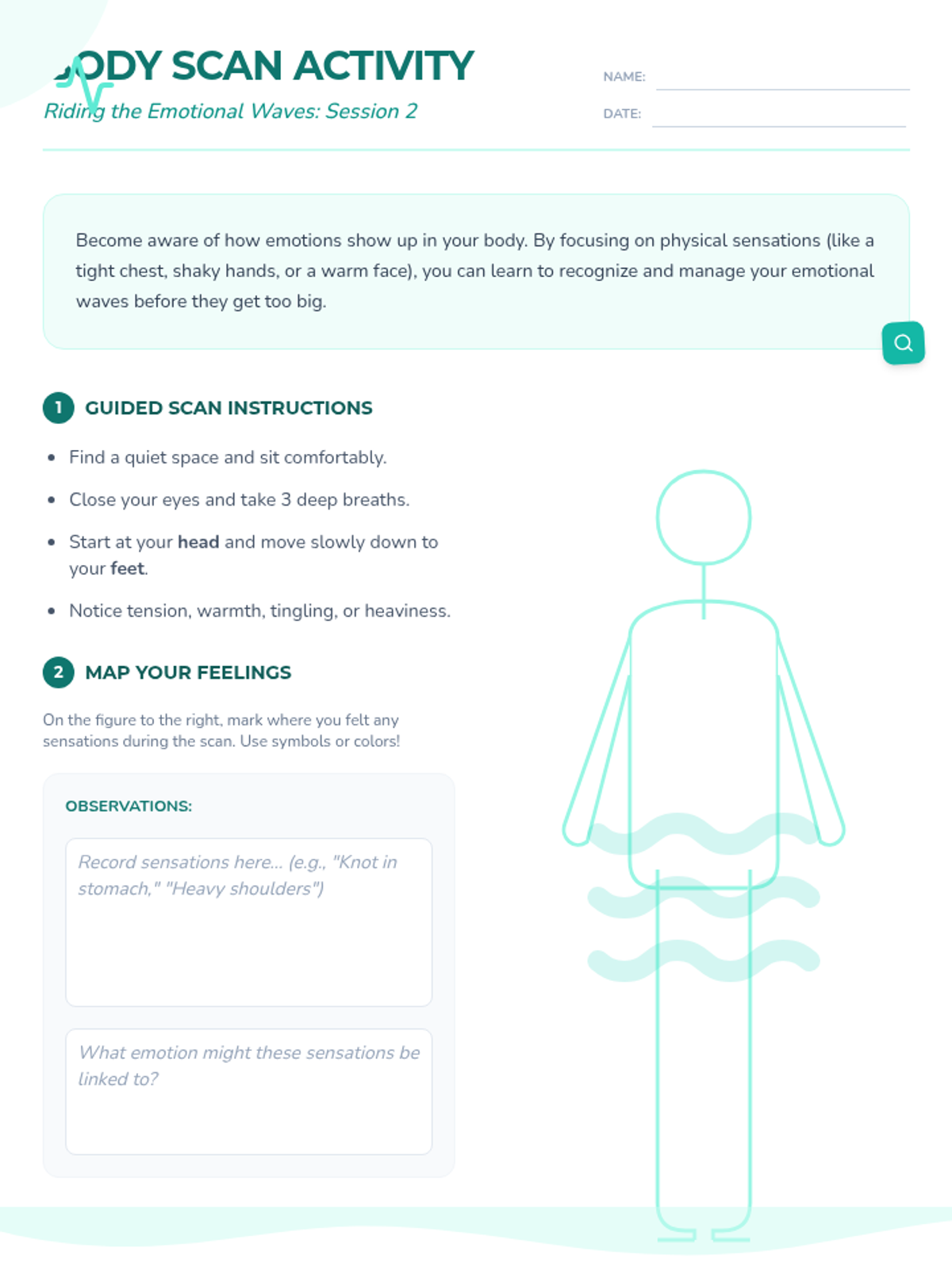 A worksheet for Session 2 that guides students through a body scan to identify physical sensations related to emotions.