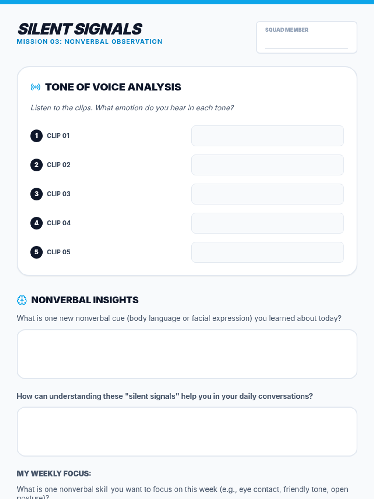 Nonverbal observation worksheet for students to record their analysis of tone of voice clips and reflect on key nonverbal cues.
