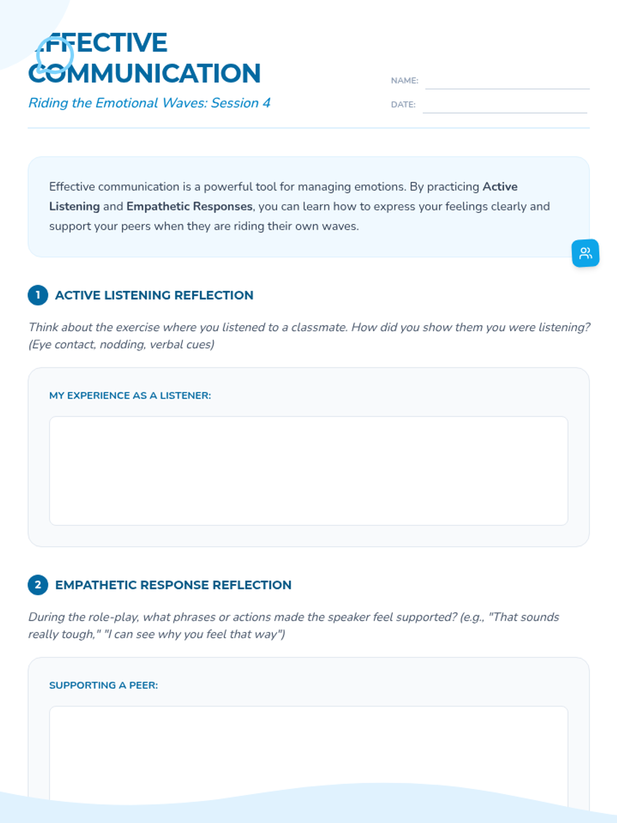 A student activity worksheet for Session 4 focused on practicing active listening and empathetic responses.