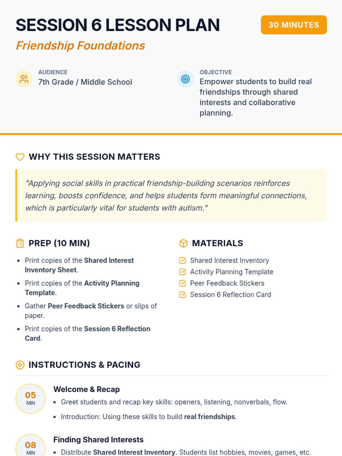 Visual presentation for Session 6, identifying shared interests and planning collaborative friendship activities.