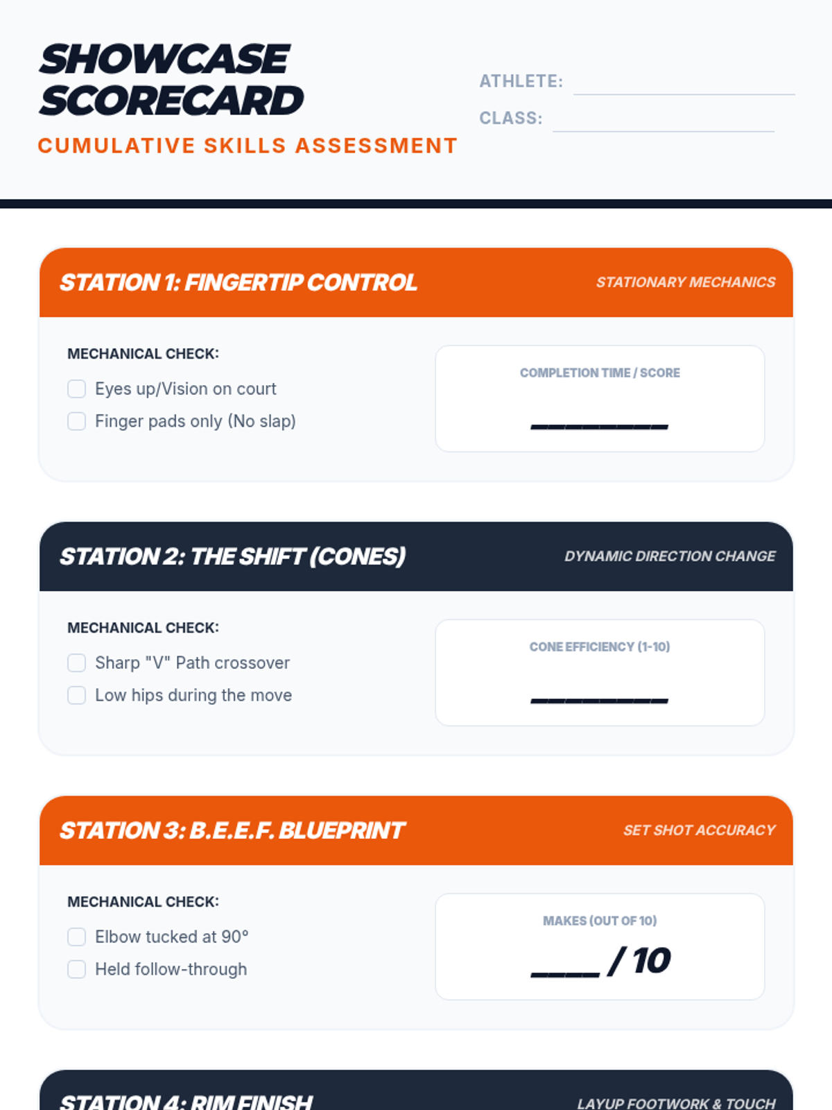 Student scorecard for the cumulative skills showcase, including check-offs for mechanics at four different stations.