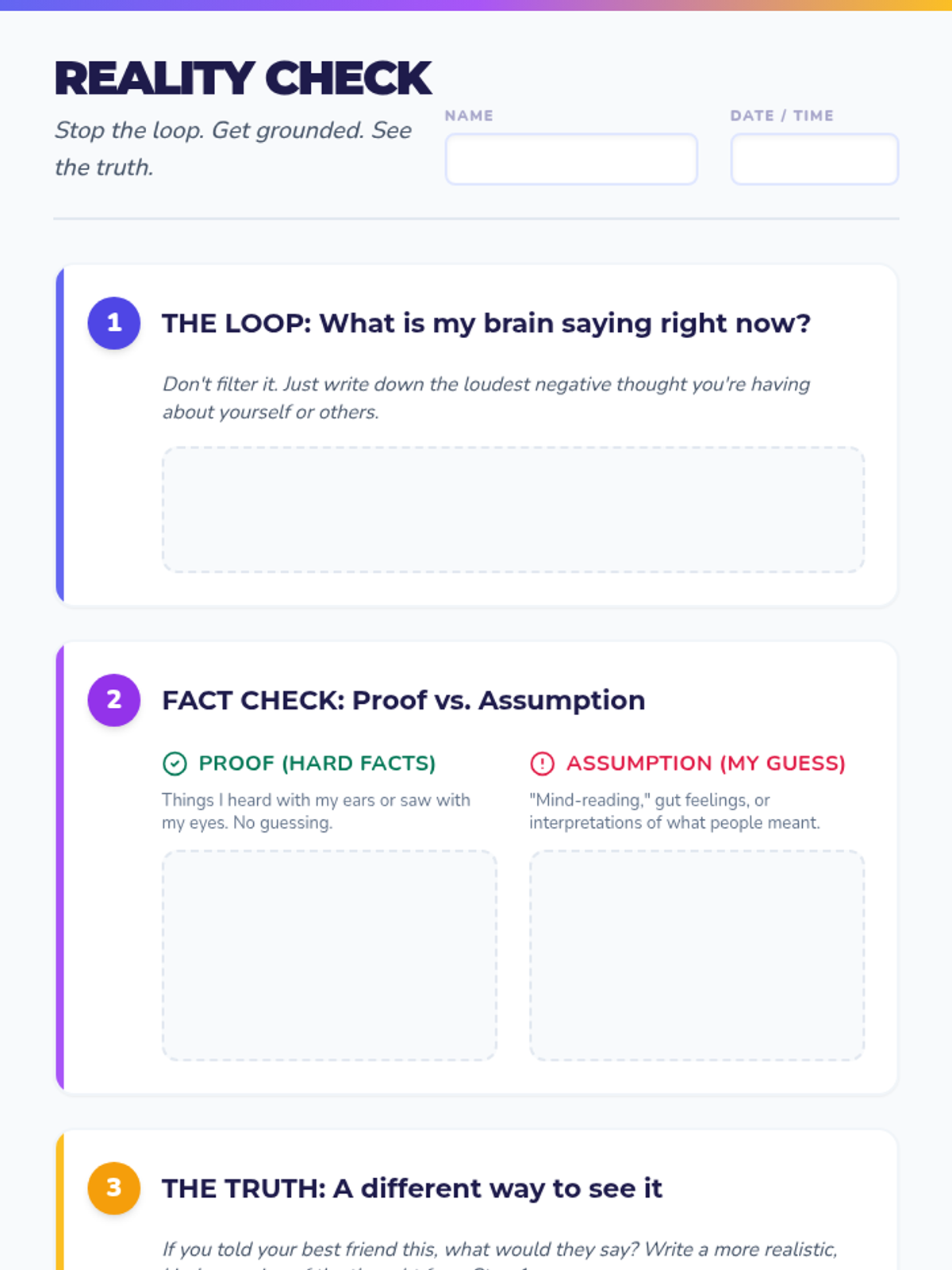 A revised crisis management worksheet for a 12-year-old student, featuring a clear 5-step process to navigate mental loops, verify facts, practice grounding, and recall personal strengths.