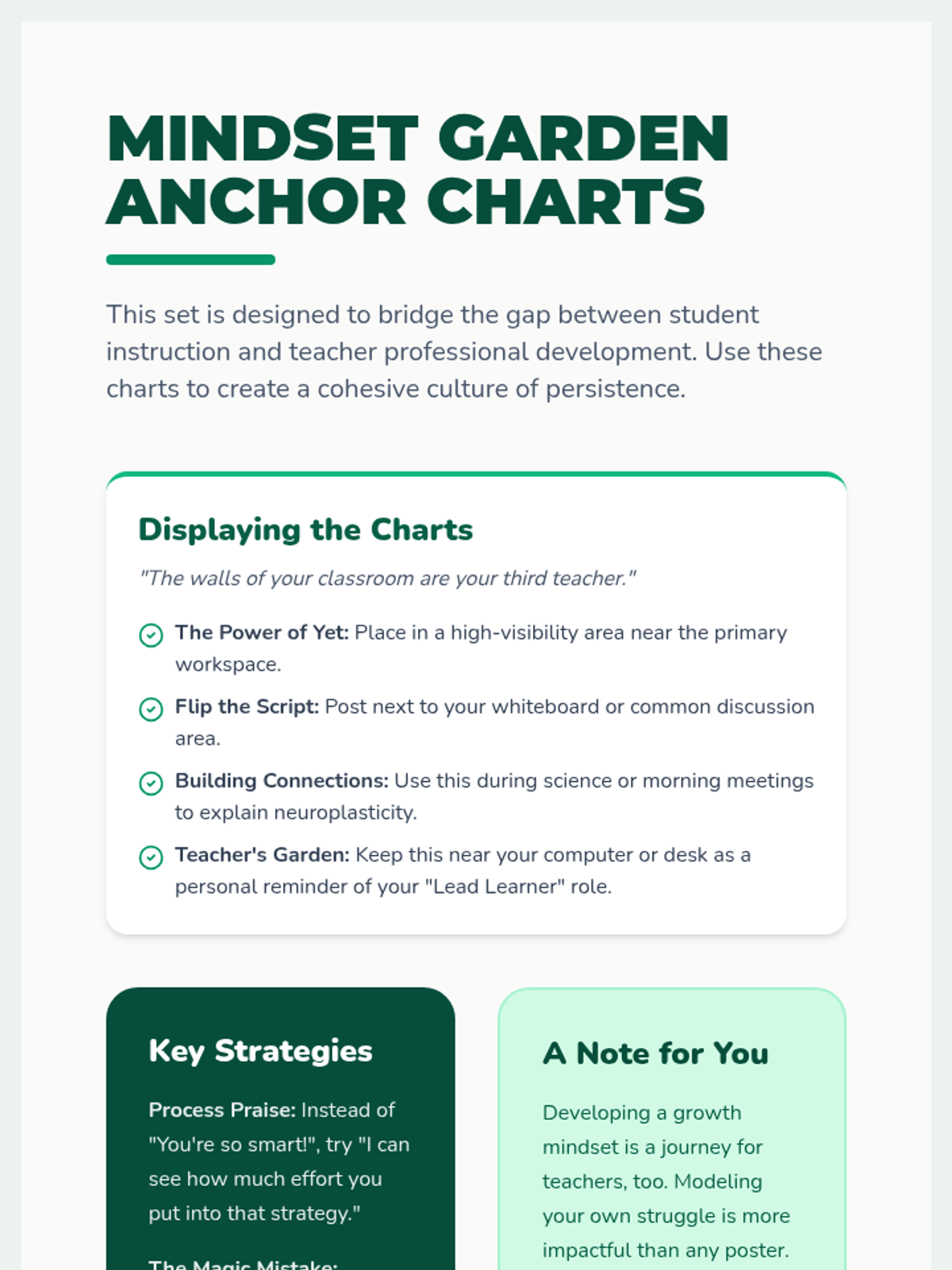 A professional set of four classroom anchor charts plus a teacher's facilitation guide. Includes high-impact visuals on the Power of Yet, language shifts, neuroplasticity, and specific growth mindset mantras for teachers to support their professional development and classroom culture.