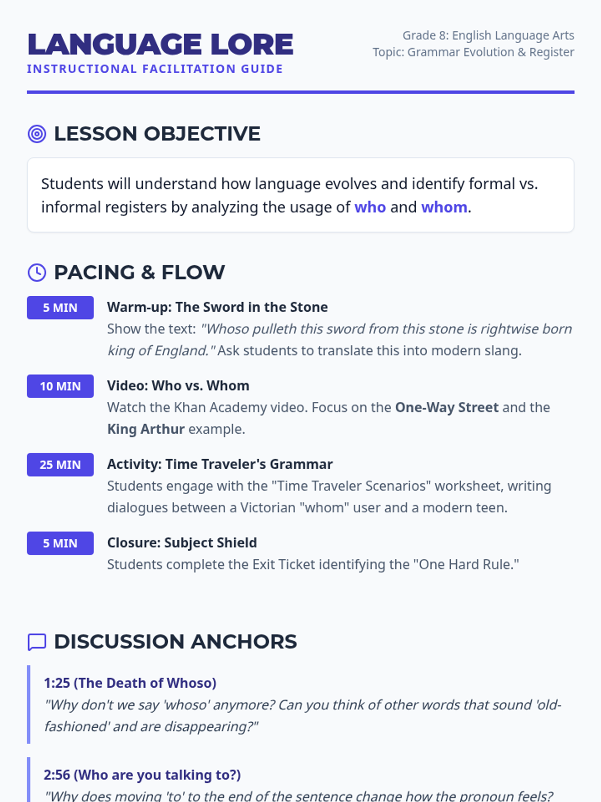 A comprehensive teacher facilitation guide for the Who vs. Whom lesson, featuring a pacing guide, discussion prompts, and an answer key for the categorization activity.