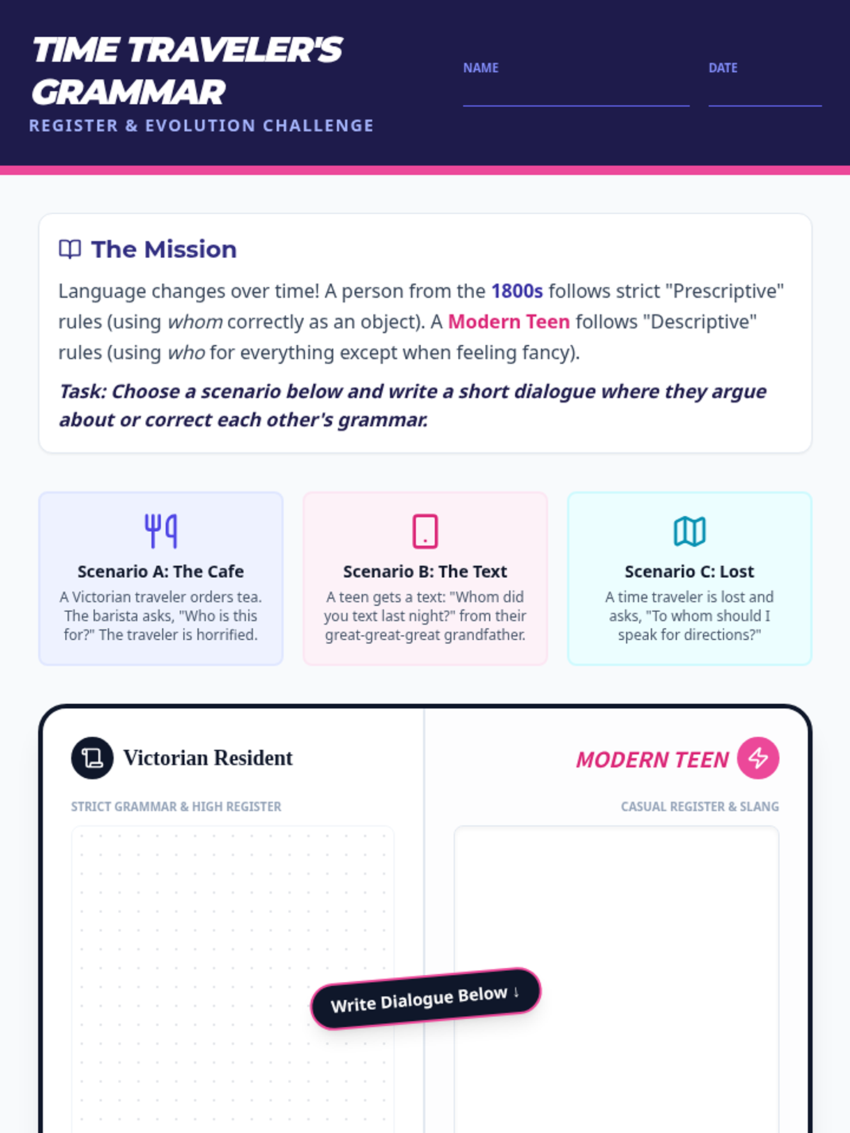 An activity sheet for the 'Time Traveler's Grammar' role-play, where students write a dialogue between a Victorian traveler and a modern teen using different language registers.