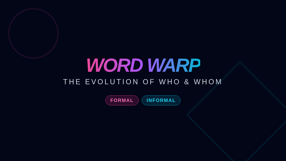 A visual presentation for the Who vs. Whom lesson, following the Khan Academy aesthetic with neon highlights, including an embedded video and structured pauses for discussion.