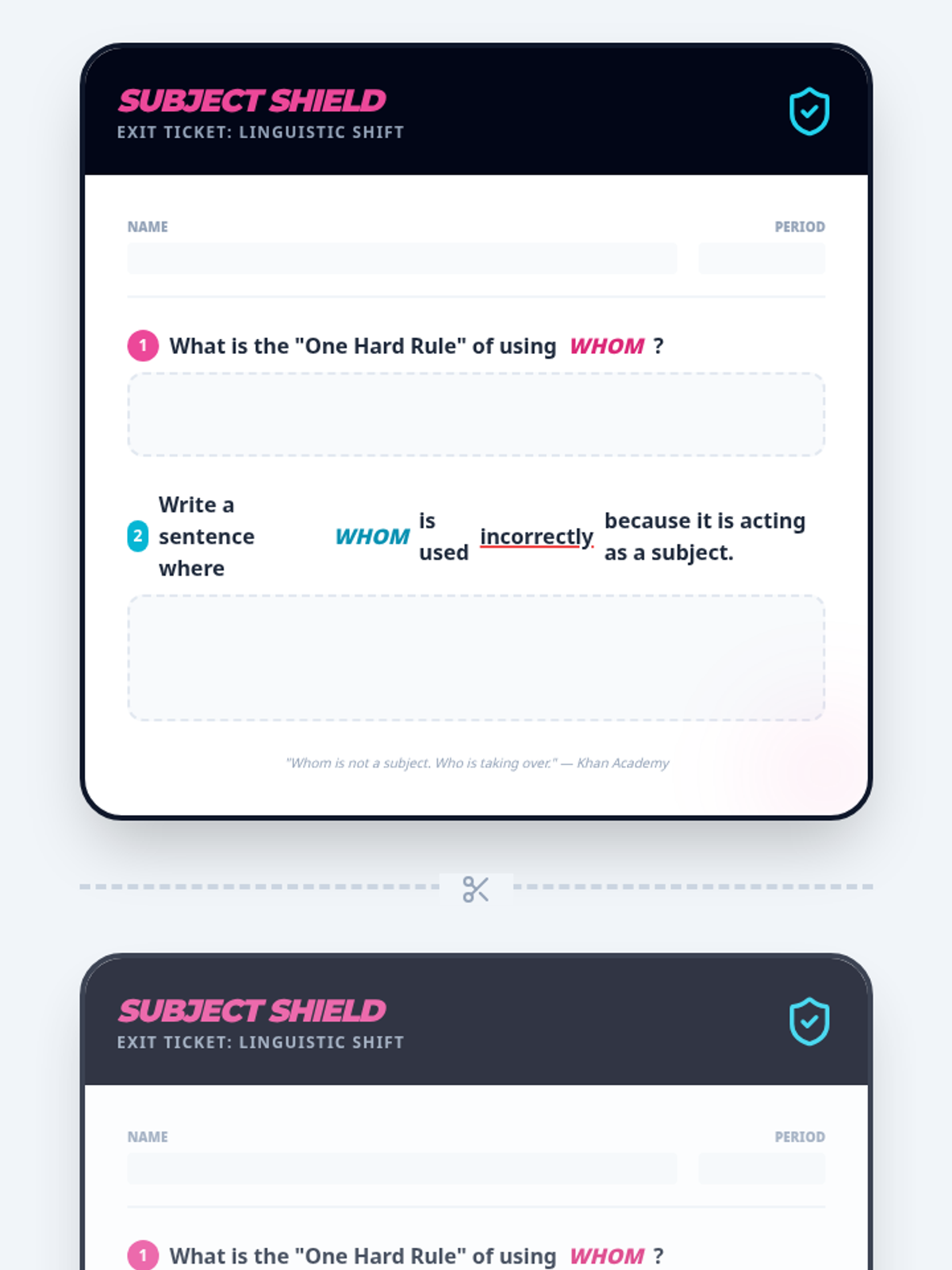 An exit ticket for the Linguistic Shift lesson, assessing students' ability to identify the 'one hard rule' of whom as a non-subject pronoun.