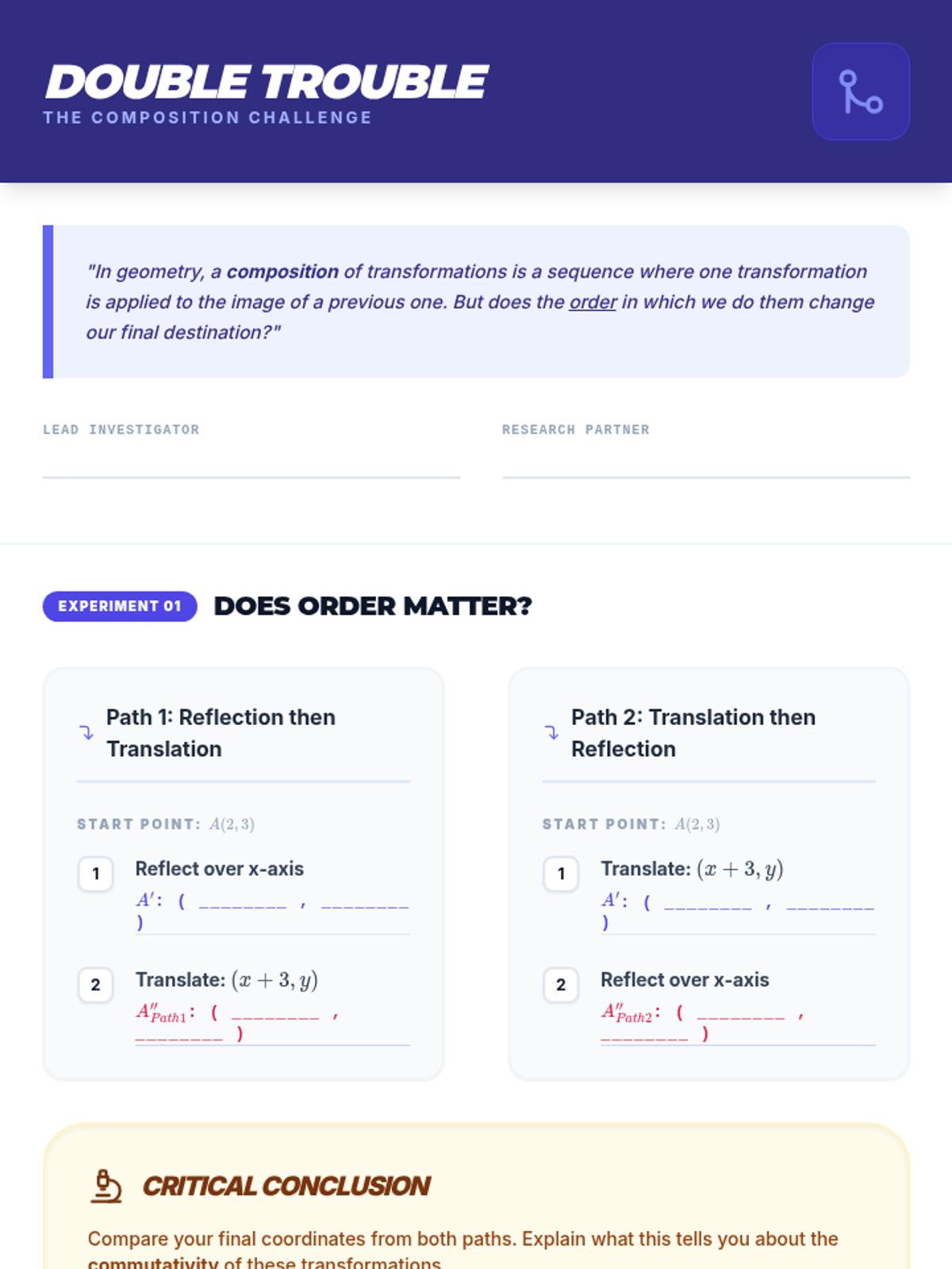 An advanced activity focusing on compositions of transformations. Students explore the non-commutative property (order matters) through coordinate calculations and a multi-step graphing challenge. Updated with improved layouts and clearer instructions.