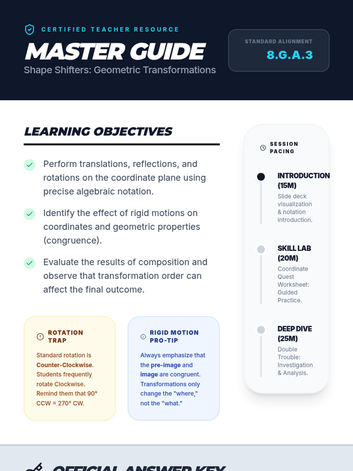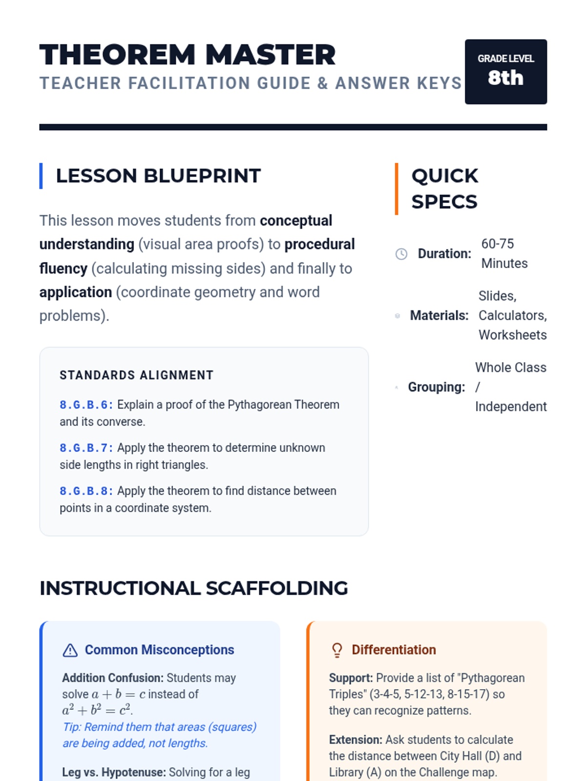 A comprehensive teacher resource including lesson pacing, standard alignment, common student misconceptions, and full answer keys for all student activities.