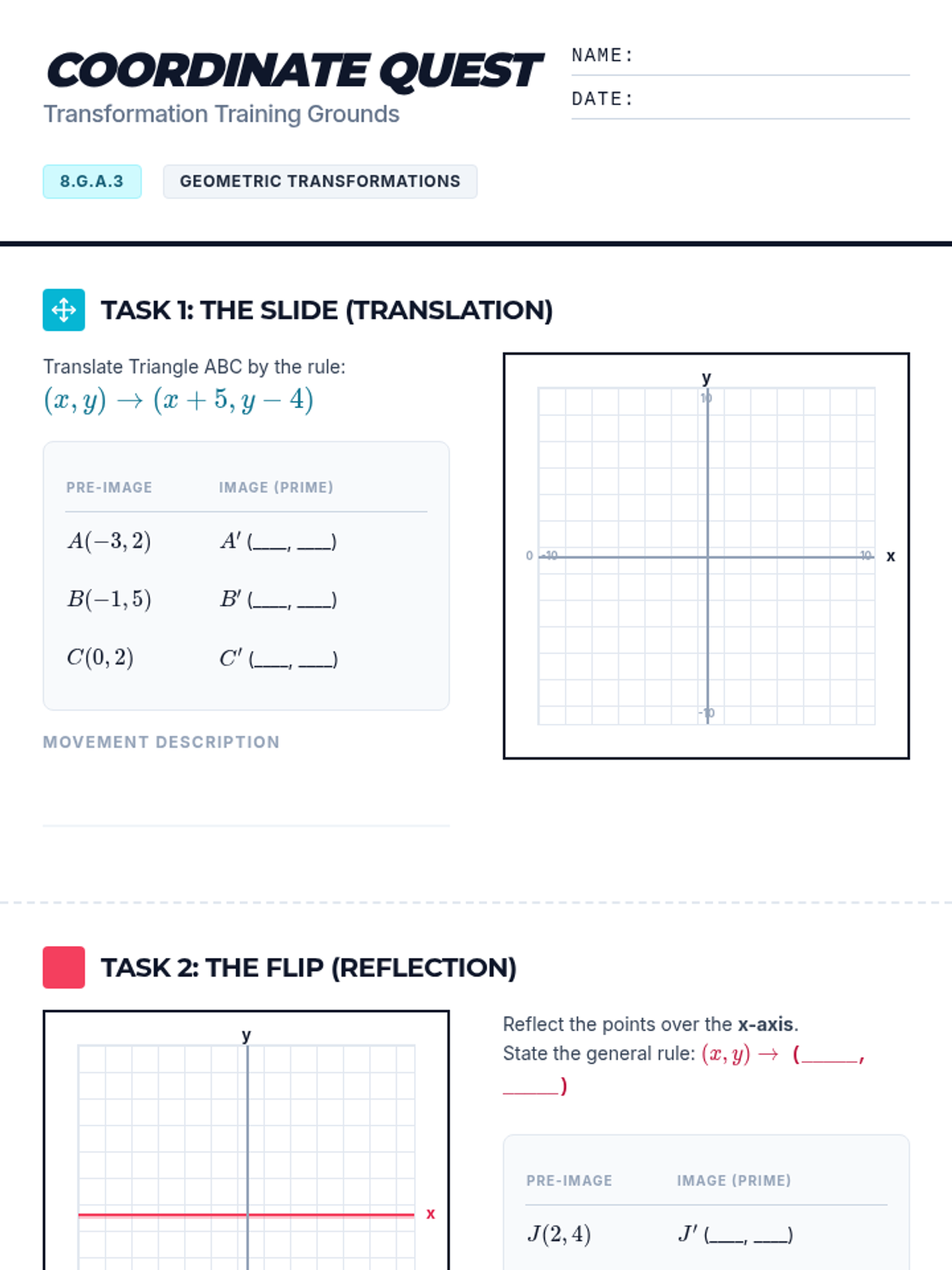 A structured worksheet for students to practice translations, reflections, and rotations on the coordinate plane. Includes coordinate tables, blank grids for graphing, and a composition challenge. Updated with axis markers and cleaner work areas.