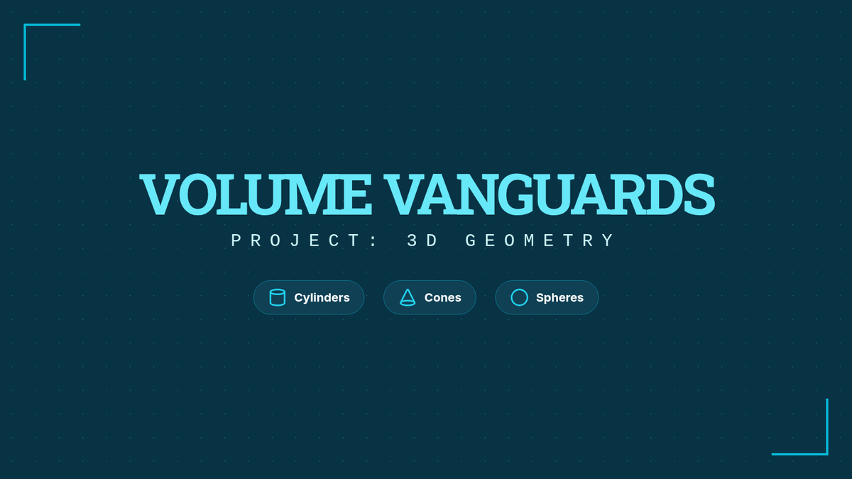 A blueprint-themed slide deck for 8th-grade volume instruction. Features clear formulas, visual diagrams of cylinders, cones, and spheres, and a "Diameter Trap" warning slide.