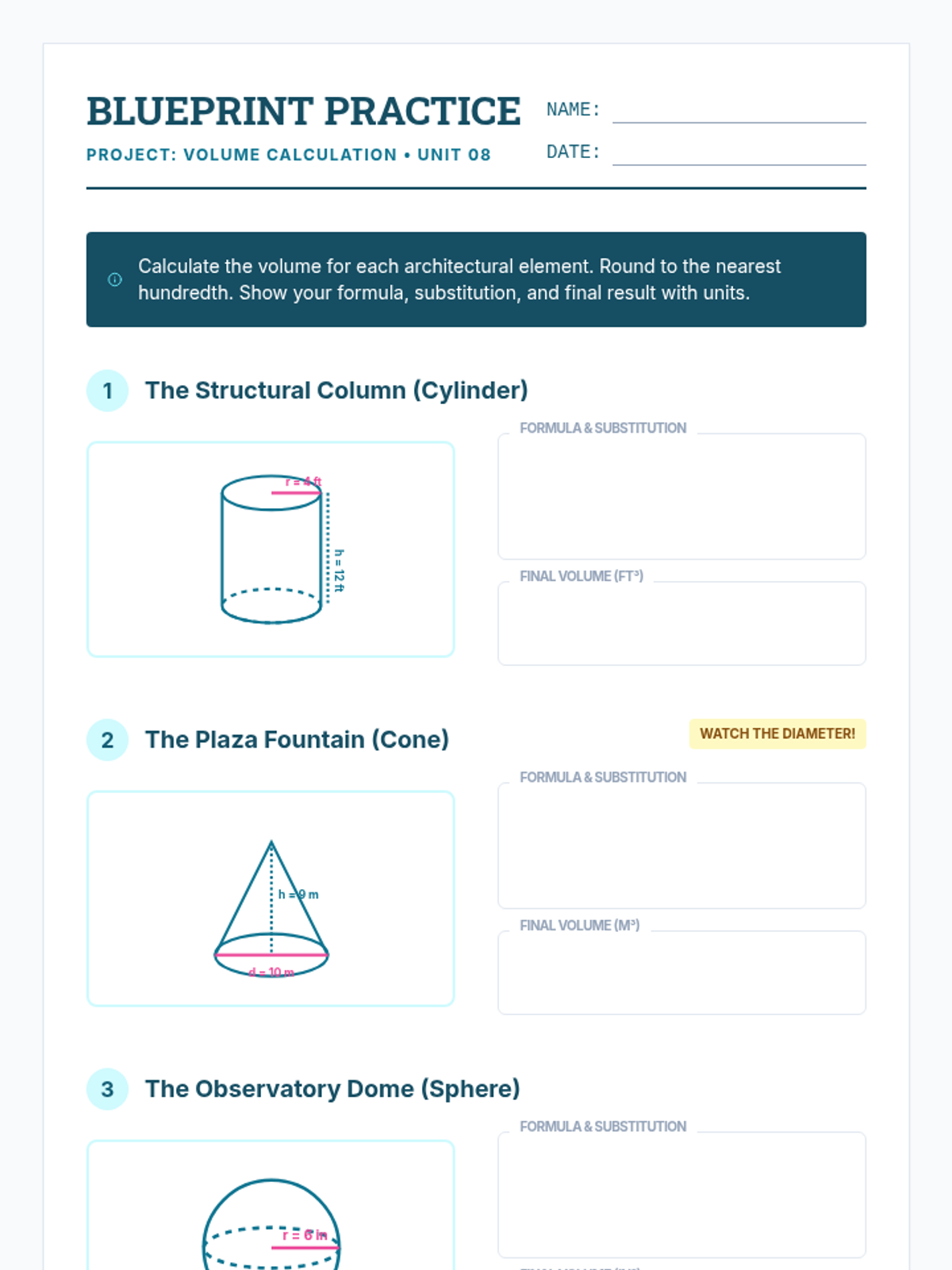 A blueprint-themed volume practice worksheet for 8th-grade geometry. It includes problems for calculating the volume of cylinders, cones, and spheres, with a specific "diameter trap" warning and an architect's challenge problem.