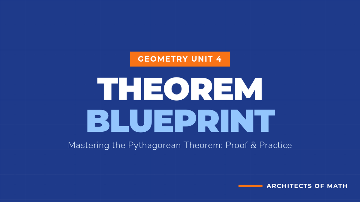 An instructional slide deck introducing the Pythagorean Theorem through visual area proofs and real-world walking distance examples, designed with a blueprint/architectural aesthetic. All text is sized for maximum visibility (minimum 24px).