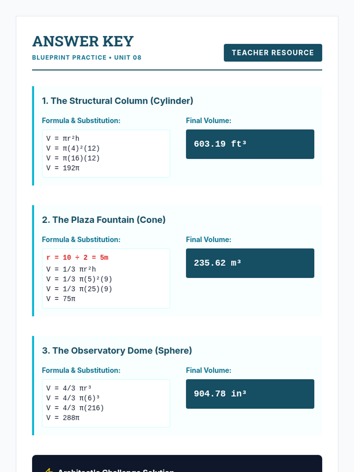 A comprehensive teacher guide for the Volume Lab intervention lesson. Includes time allocations, instructional strategies for the 1/3 rule, scaffolding tips, common misconception tables, and assessment guidance.