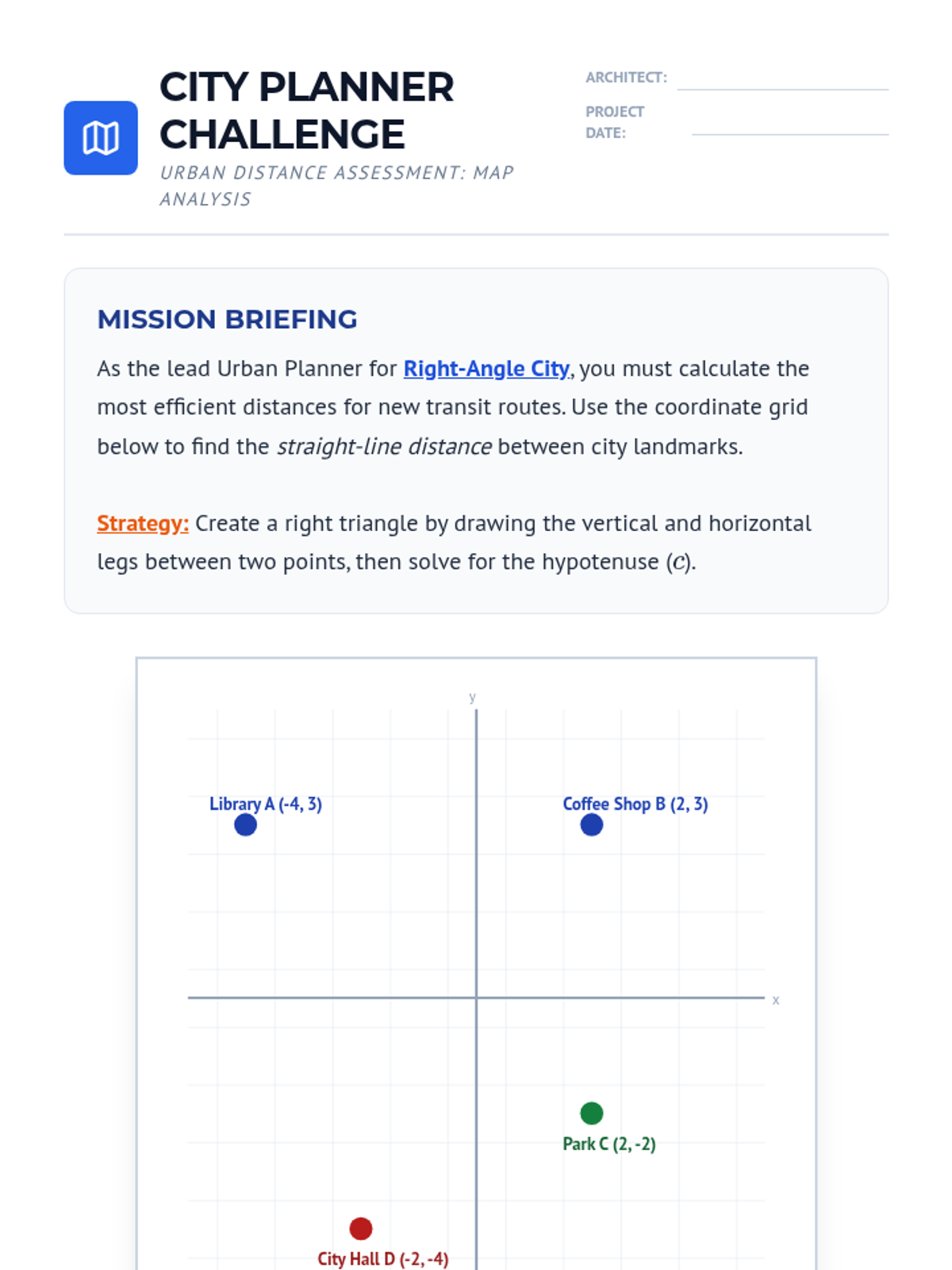 A coordinate geometry activity where students calculate the distance between city landmarks by creating right triangles on a grid, reinforcing Standard 8.G.B.8.