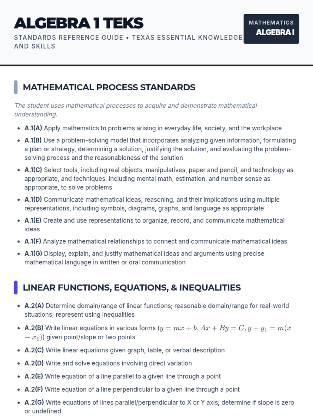 A comprehensive, formatted reference list of all Algebra 1 Texas Essential Knowledge and Skills (TEKS) organized by standard strands for teacher use. Includes Process Standards.