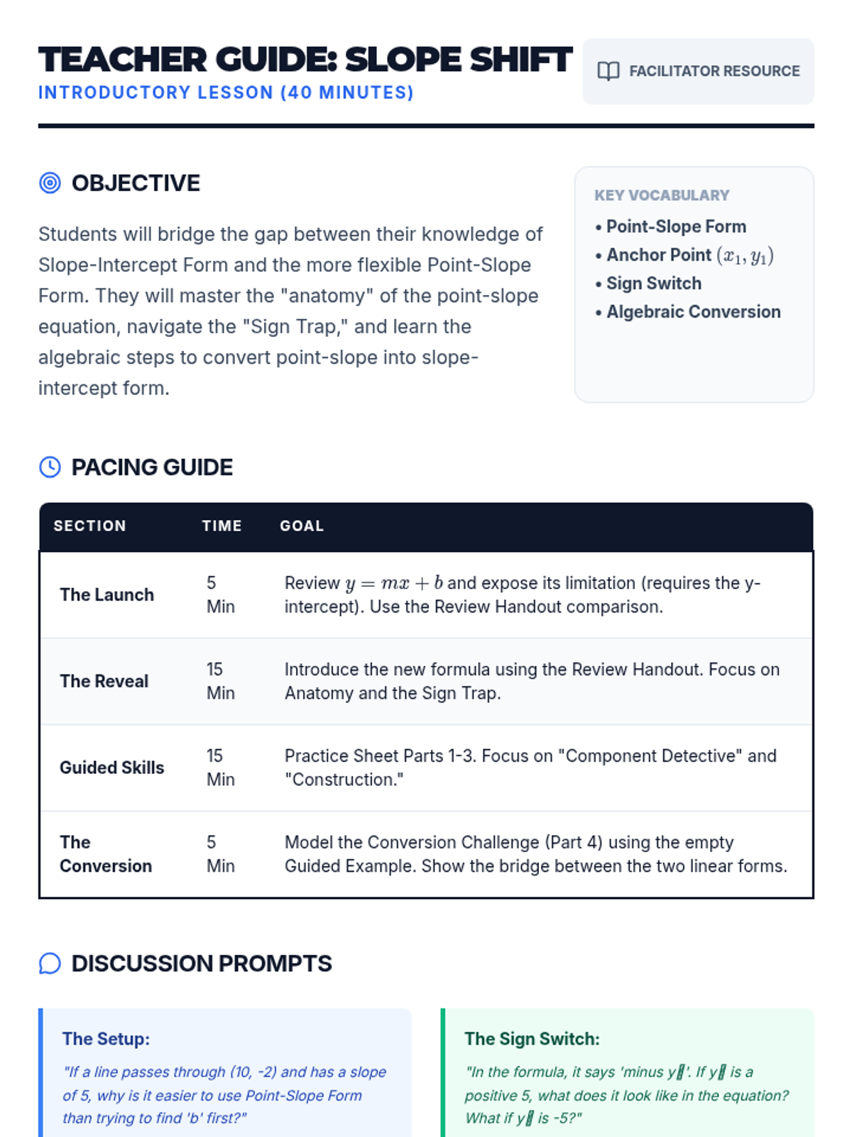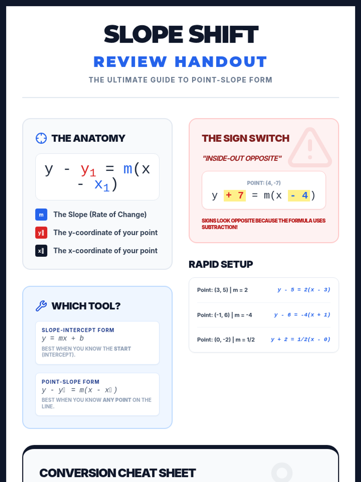 A one-page review handout for students summarizing the key concepts of Point-Slope Form. Includes anatomy, sign-flip rules, form comparison, and a step-by-step conversion guide. Removed all dollar signs and dark backgrounds for easier printing.