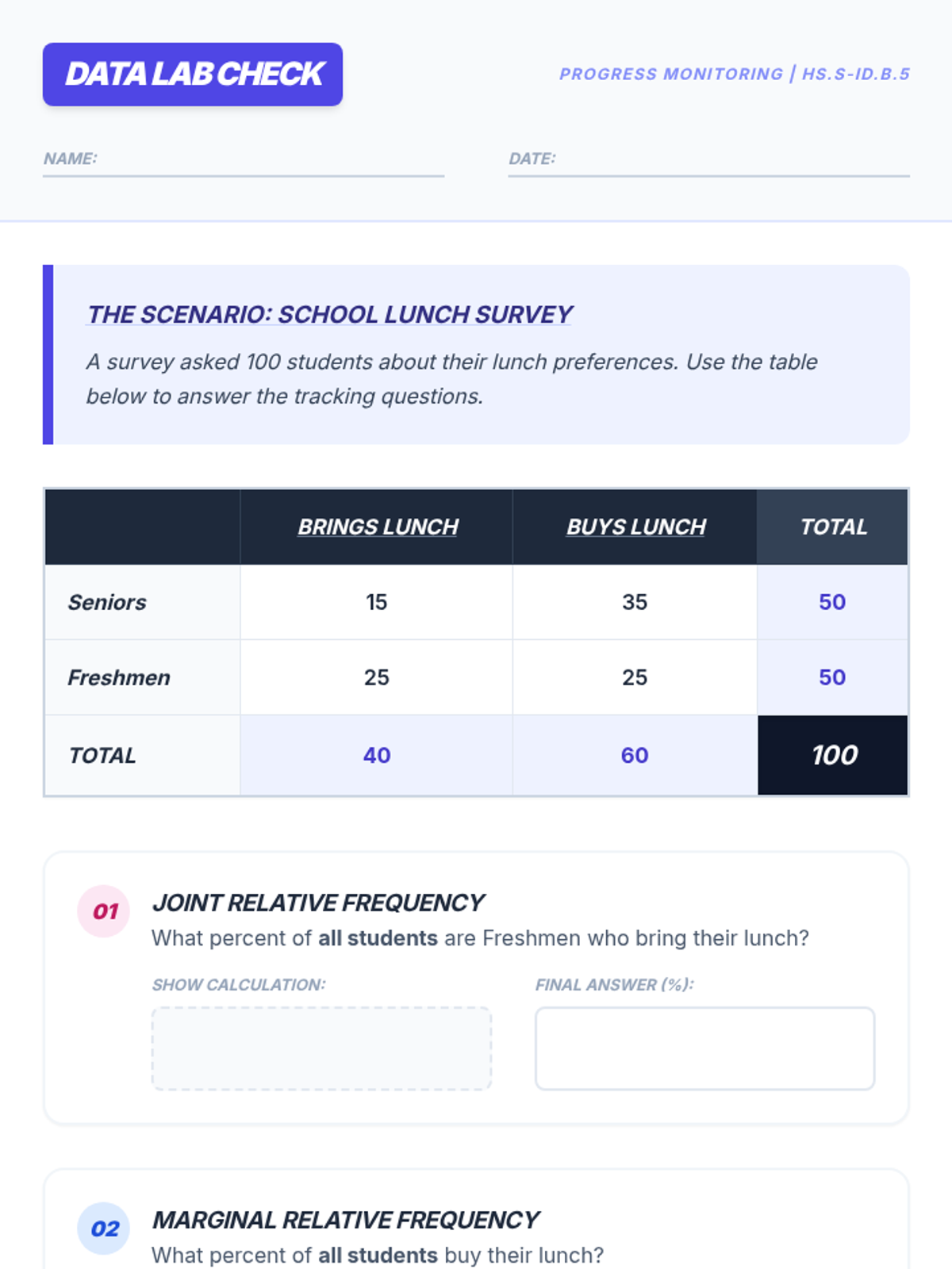 A progress monitoring exit ticket focused on applying joint, marginal, and conditional relative frequency calculations to a school lunch survey data set.