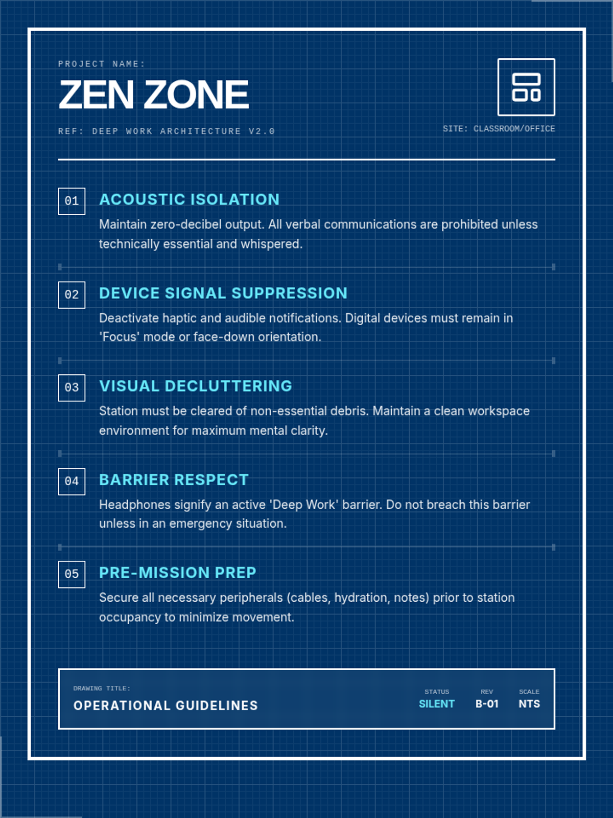 A technical blueprint-inspired poster for the Zen Zone, featuring technical terminology and a drafting aesthetic. Perfect for a modern or STEAM-focused classroom.
