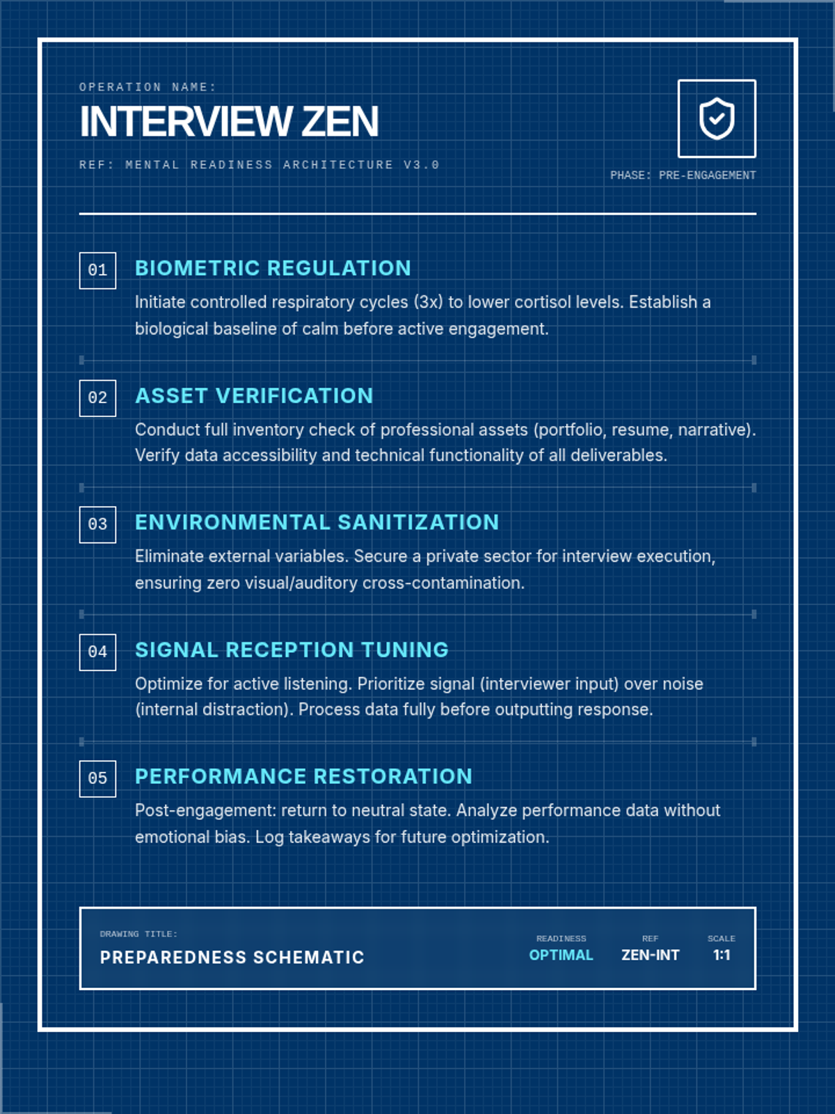 A technical blueprint-inspired poster for 'Interview Zen', focusing on biological and technical readiness. Features a drafting aesthetic with schematic components for interview preparation.