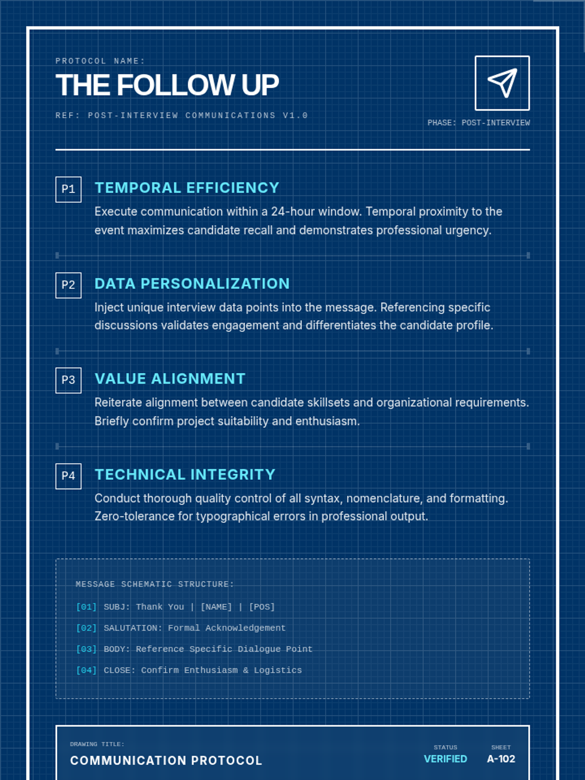 A technical blueprint-inspired infographic for post-interview follow-up procedures, featuring technical terminology and a drafting aesthetic. Guide for professional communication.