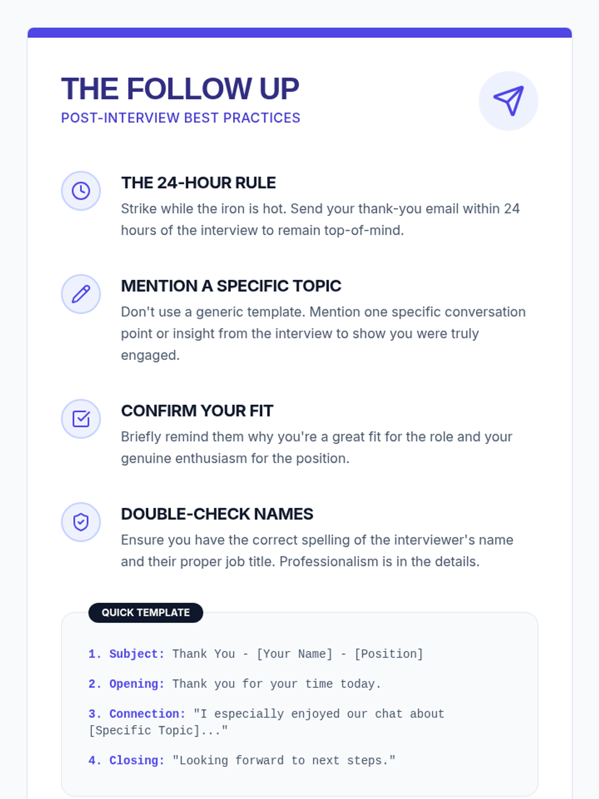 A professional guide for post-interview follow-ups, featuring a checklist of best practices and a sample email structure. It focuses on timing, personalization, and professionalism.