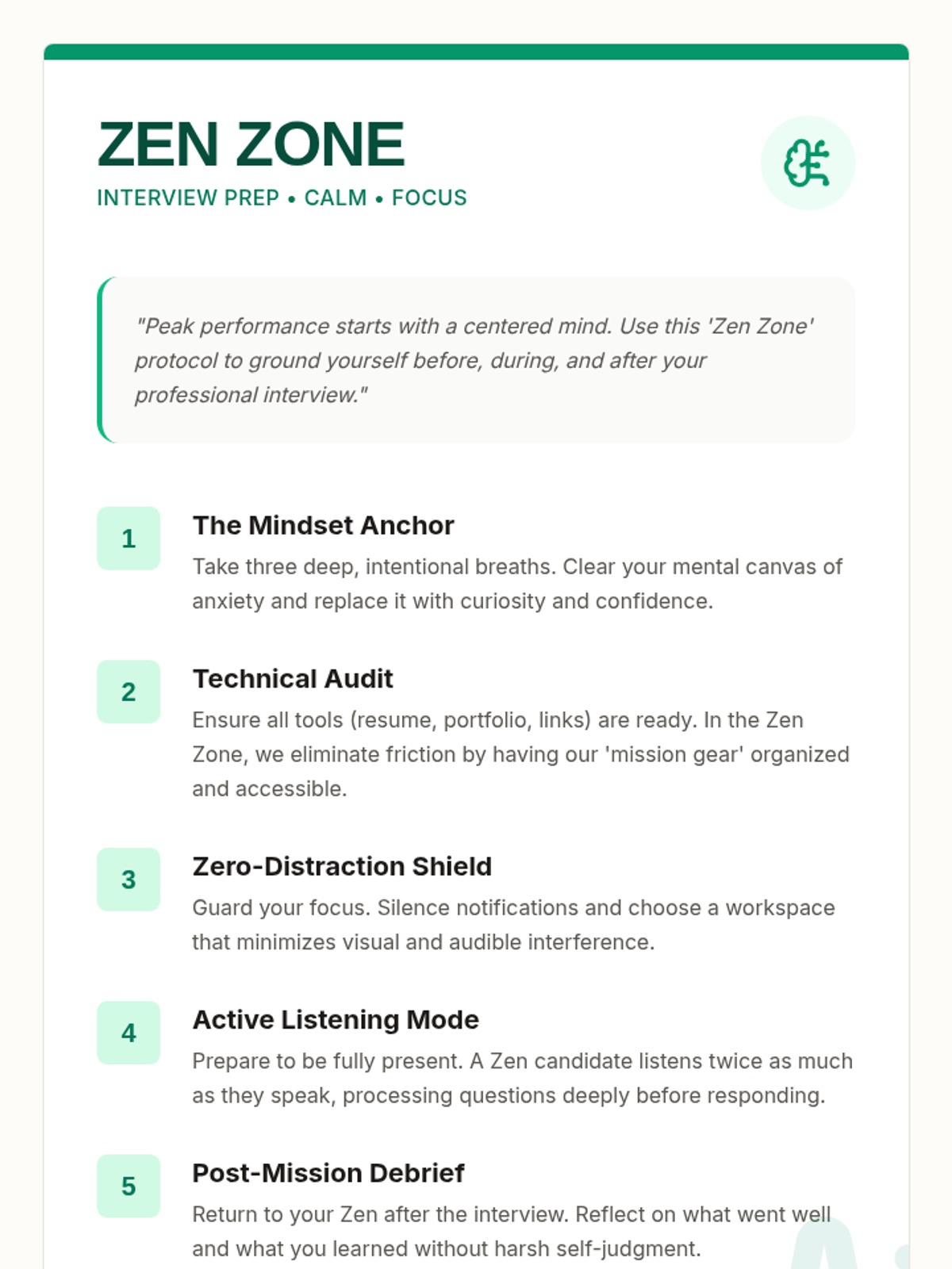 A professional infographic for 'Interview Zen Zone', focusing on mental and physical preparedness before an interview. It provides five rules for staying calm, focused, and ready.
