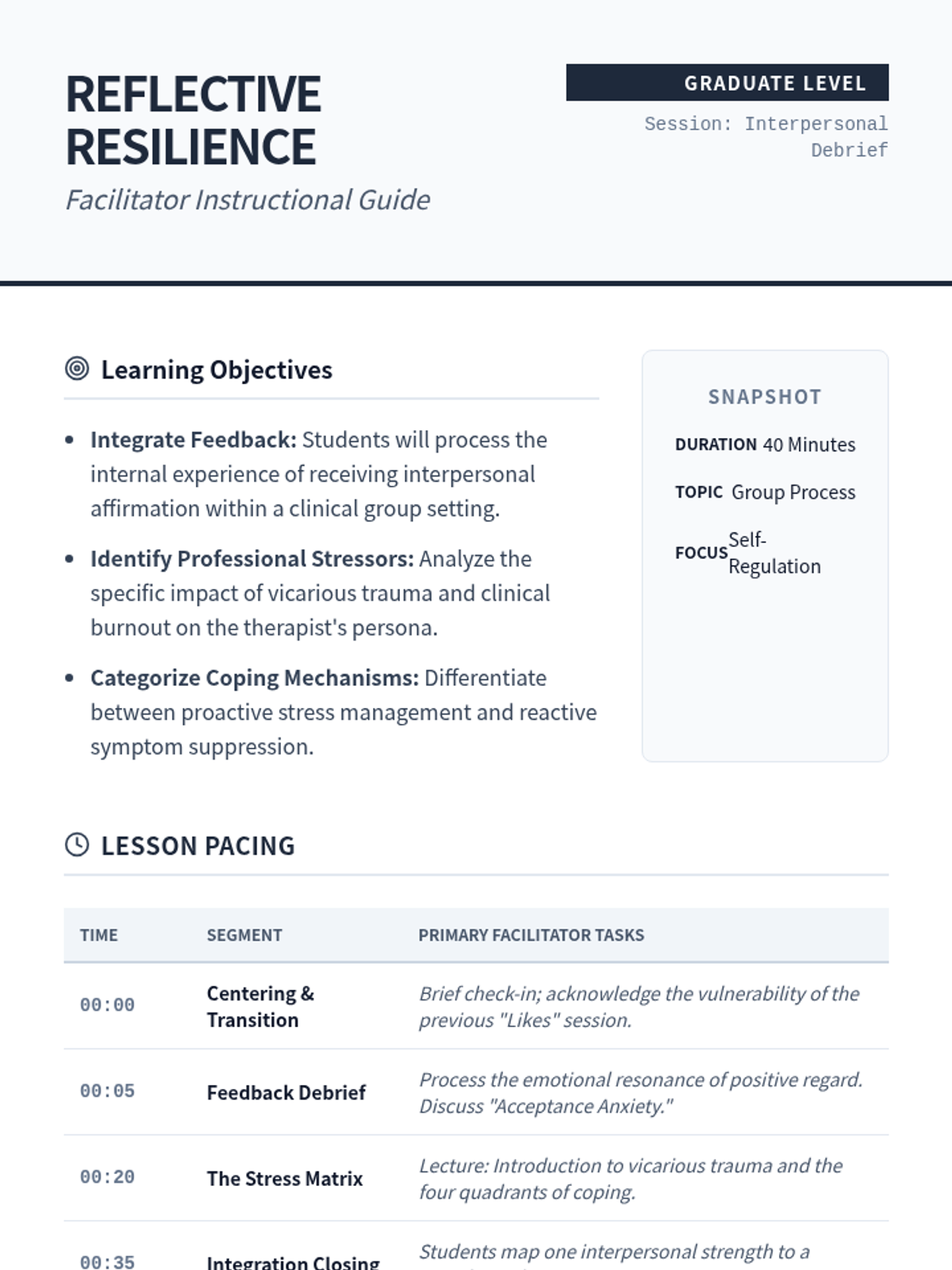 A comprehensive facilitator guide for graduate-level counseling educators, outlining a 40-minute session structure to debrief group feedback and introduce professional stress management strategies.