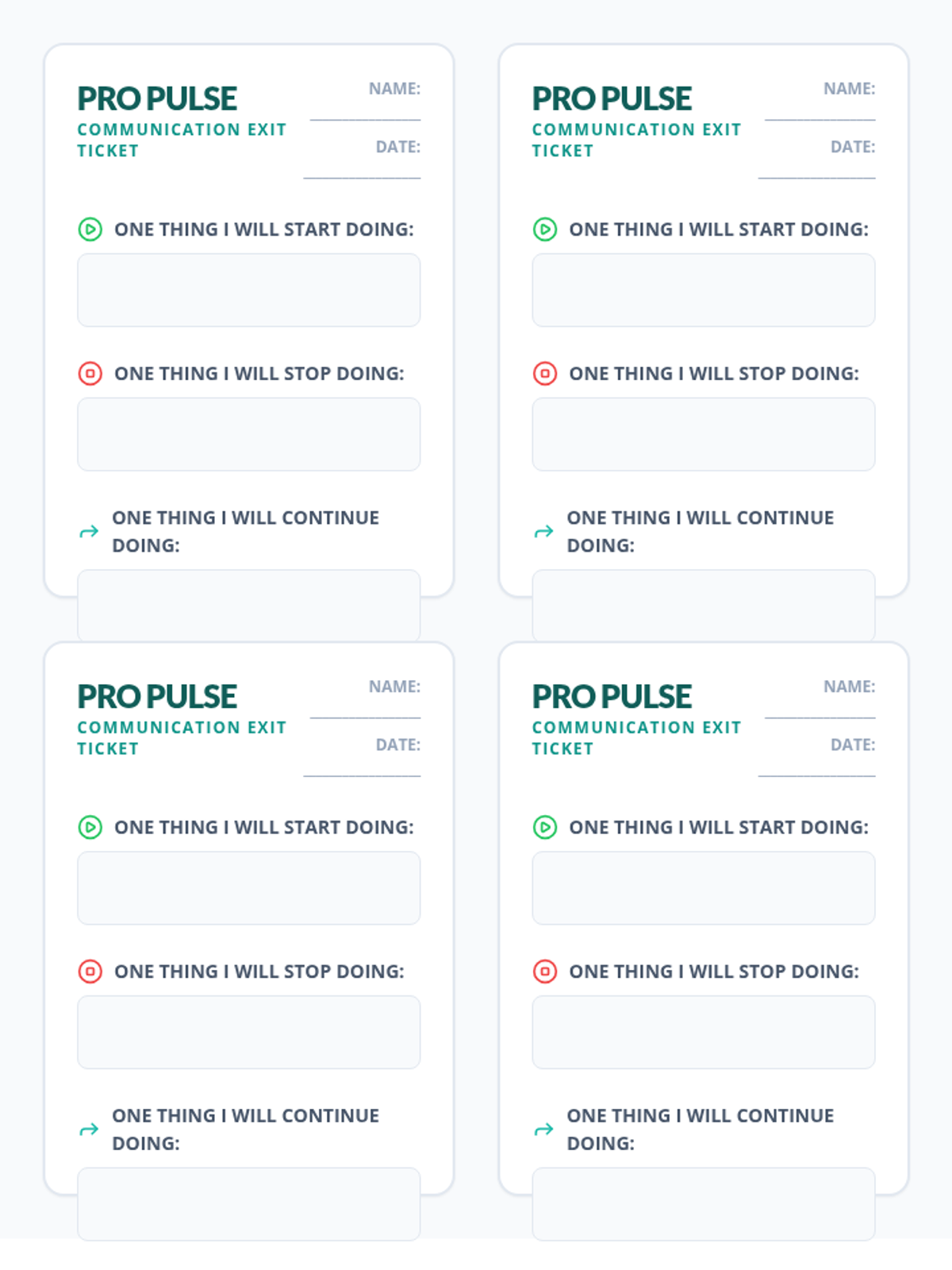 A compact exit ticket for students to reflect on their professional communication habits (Start, Stop, Continue) and define their personal communication "Golden Rule." Duplicated 4-up for easy printing.