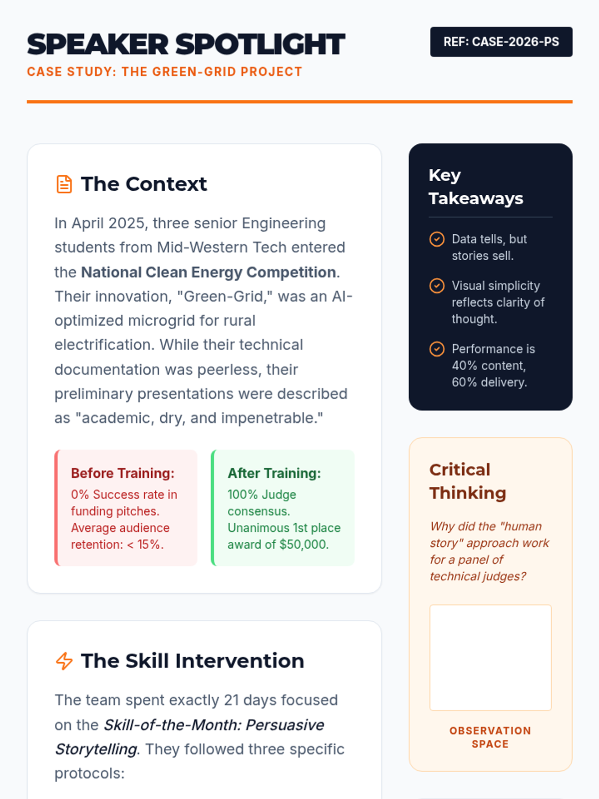 A detailed case study document analyzing the 'Green-Grid' student team's success through public speaking enhancement, designed for college-level discussion and analysis.