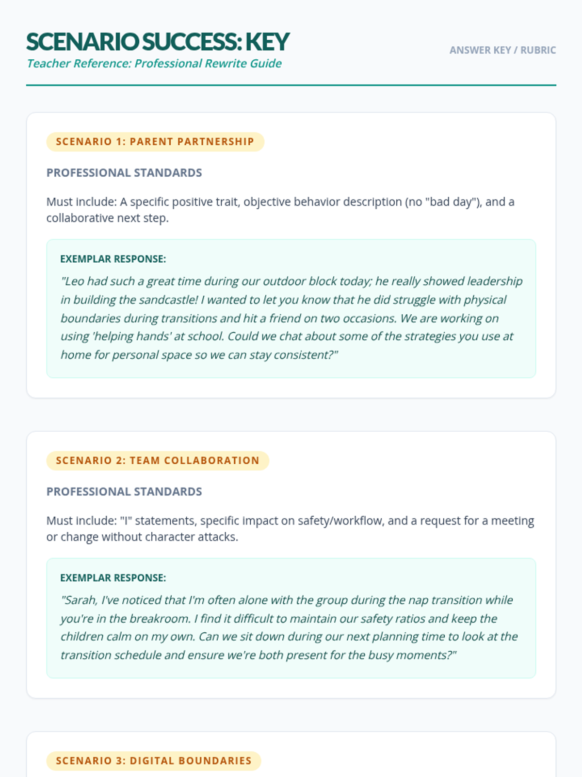 An answer key for the Scenario Success worksheet, providing exemplar professional rewrites and teacher guidance for addressing each communication challenge.
