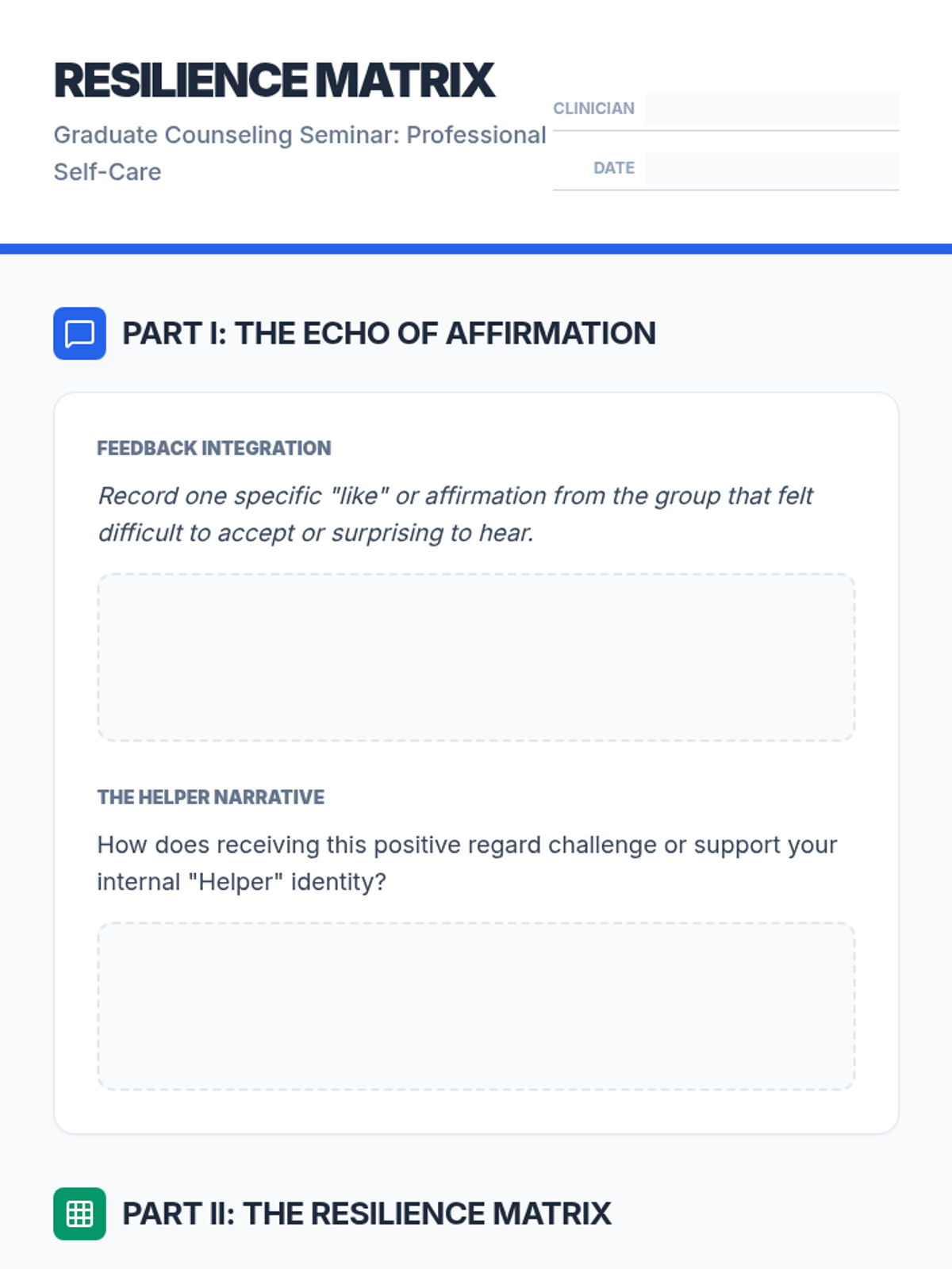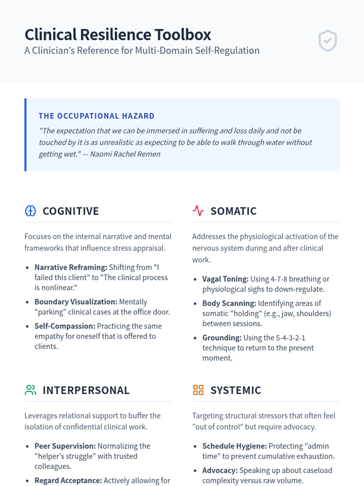 A high-level reference sheet for graduate counseling students, detailing evidence-based strategies across cognitive, somatic, interpersonal, and systemic domains of professional resilience.